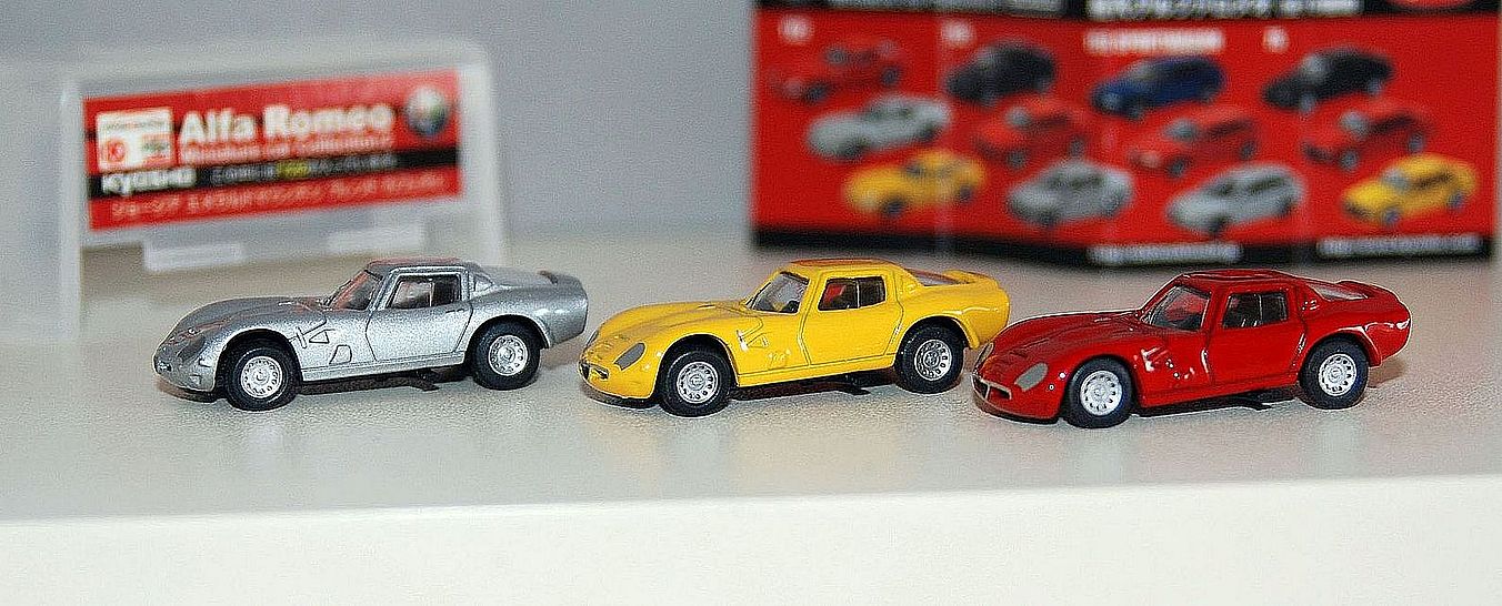 Nabízím exkluzívní miniaturní kovové modely Alfa Romeo - KYOSHO v měřítku 1/100 (cca 4cm). Samostatně neprodejné (pouze v Japonsku jako dárek k nápoji v roce 2009).