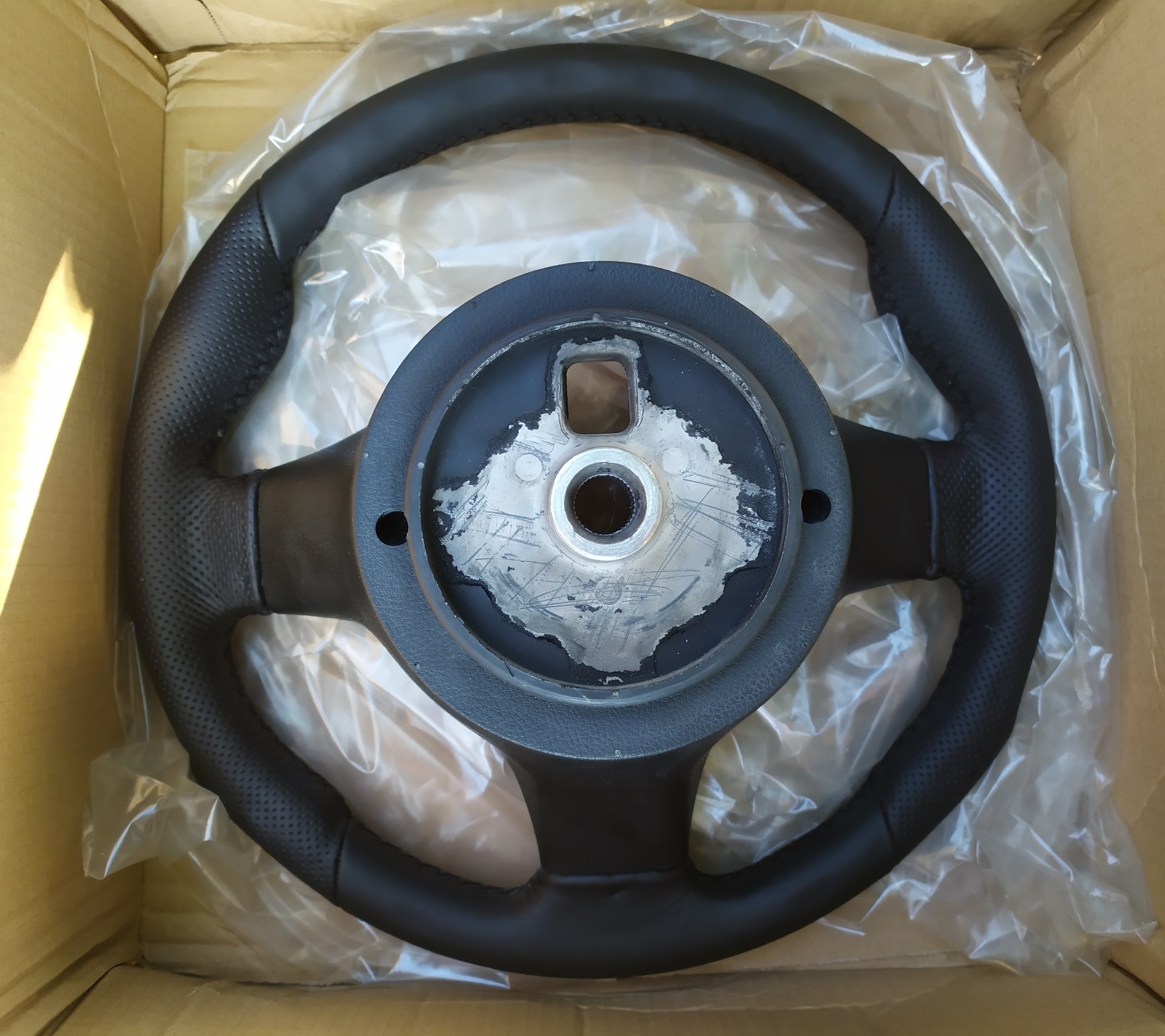 Prodal jsem tenhle týden své staré TI sedačky, prodal 166 a konečně se mi povedlo najít volant, který snad bude splňovat požadavky. Naživo se mi moc nezamlouvala práce českých firem, které obšívají volanty, takže jsem na popud Flipshida zabrousil do Polska a objednal na Allegru prostřednictvím firmy, která tam zprostředkovává nákupy se zasláním na adresu v Čechách. Volant vypadá hezky, zpracování je opravdu pěkné, na fotkách v krabici je ještě lesklý od nějakého konzervačního prostředku, v autě už očištěný a zlehka naimpregnovaný osvědčeným Sealentem od Dodo Juice. Oproti origo TI je prošitý černou nití (jako to má výbava Sport), což se ale podle mě stejně líp hodí k mému nazelenalému dekoru.