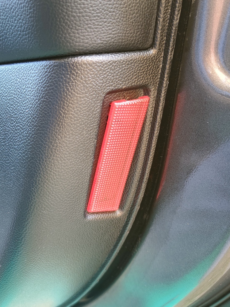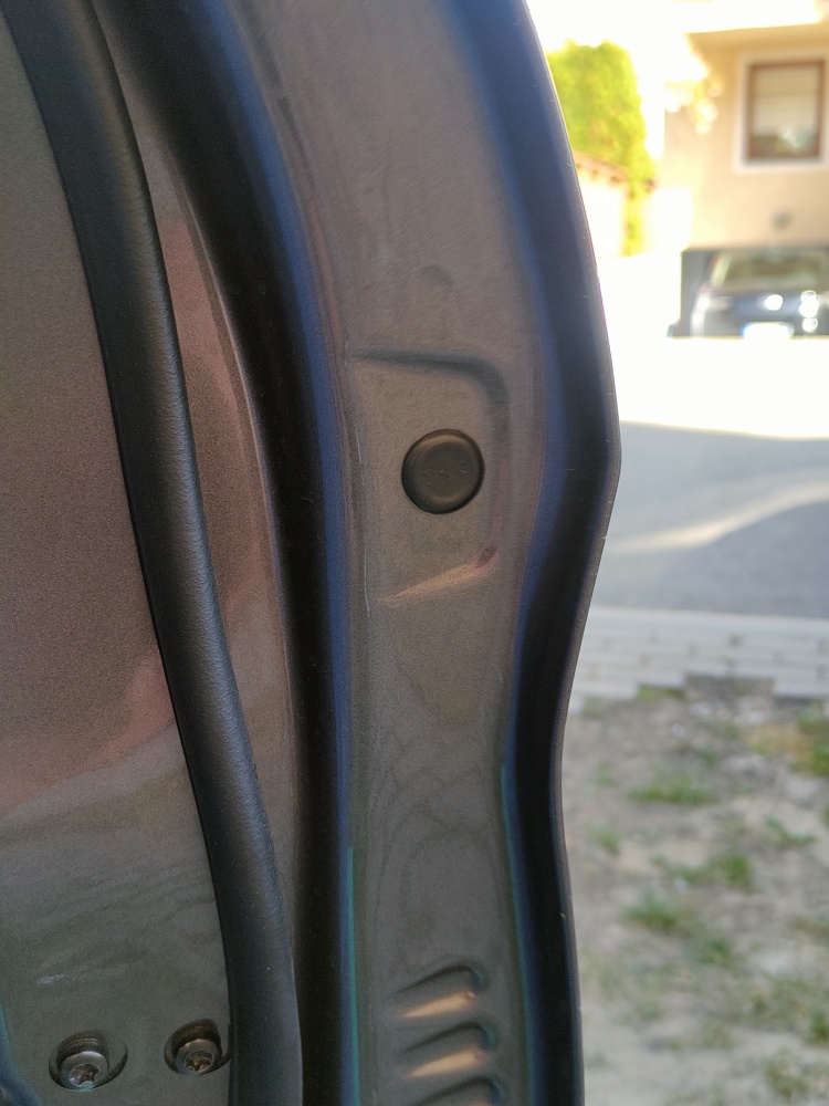 Na předních dveřích je ještě dvojice vrutů s křížovou hlavou ze zadního boku. Jeden pod krytkou:
