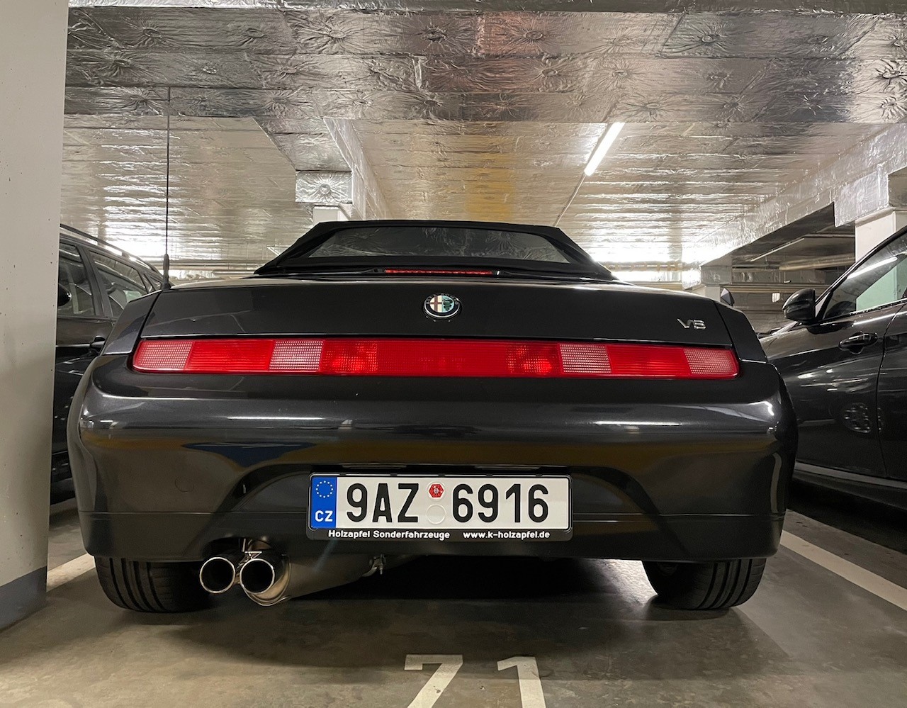 Tak jsem loni v létě (8/2023) rozšířil vozový park a přivezl si z Německa zase Spidera. Vlastně stejného, jako jsem už před lety měl, akorát o rok mladšího, z roku 1996, 916tku třílitr. Jeden fanda tam sehnal 3,2 24V a tak se tohoto po roce a kousek zbavil, byl třetí majitel. Najeto cca 95 tisíc, celkem vyplněná serviska, po rozvodech, nový nerez Ragazzon, nová střecha, prý i brzdy, DAB radio, náplně. Snad rozumná cena, vlastně nakonec se slevou. Totiž, když už jsem mu chtěl psát že koupím... tak mi zmizelo auto z webu. Tak jsem zaklel a hledal jiné auto a ukázalo se, že majitel nevydržel - a zlevnil ho. ;-) Za týden bylo doma. No, ,radost, po ose přijelo do Prahy od Frankfurtu, přivezl jsem si ho sám. Posledních 100 km před hranicemi už jsme mastili přes 200, otrnulo nám a jelo to krásně. Já v spideru, žena v Giulii za mnou.
