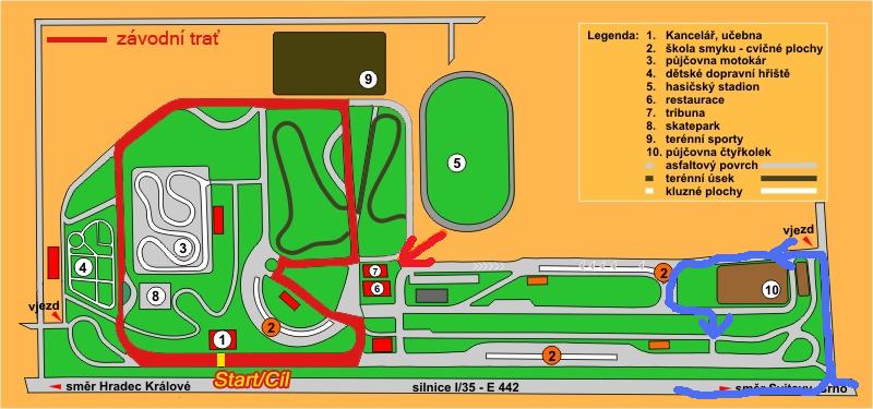 ahoj, žlutá je Depo, červená místo pro diváky, nejlepší je tribuna, modrá slabá je možná varinta příjezdu k areálu, ale myslím si, že tam to nepůjde, proto je nejjistější odbočit vpravo ze směru od Litomyšle za letištěm a před areálem na cestu, která vede na vyhrazenou plochu pro parkování pro diváky, aspoň vloni to tak bylo, je to mimo obrázek, ale udělal jsem tím směrem silnou nepovedenou modrou šipku :-)