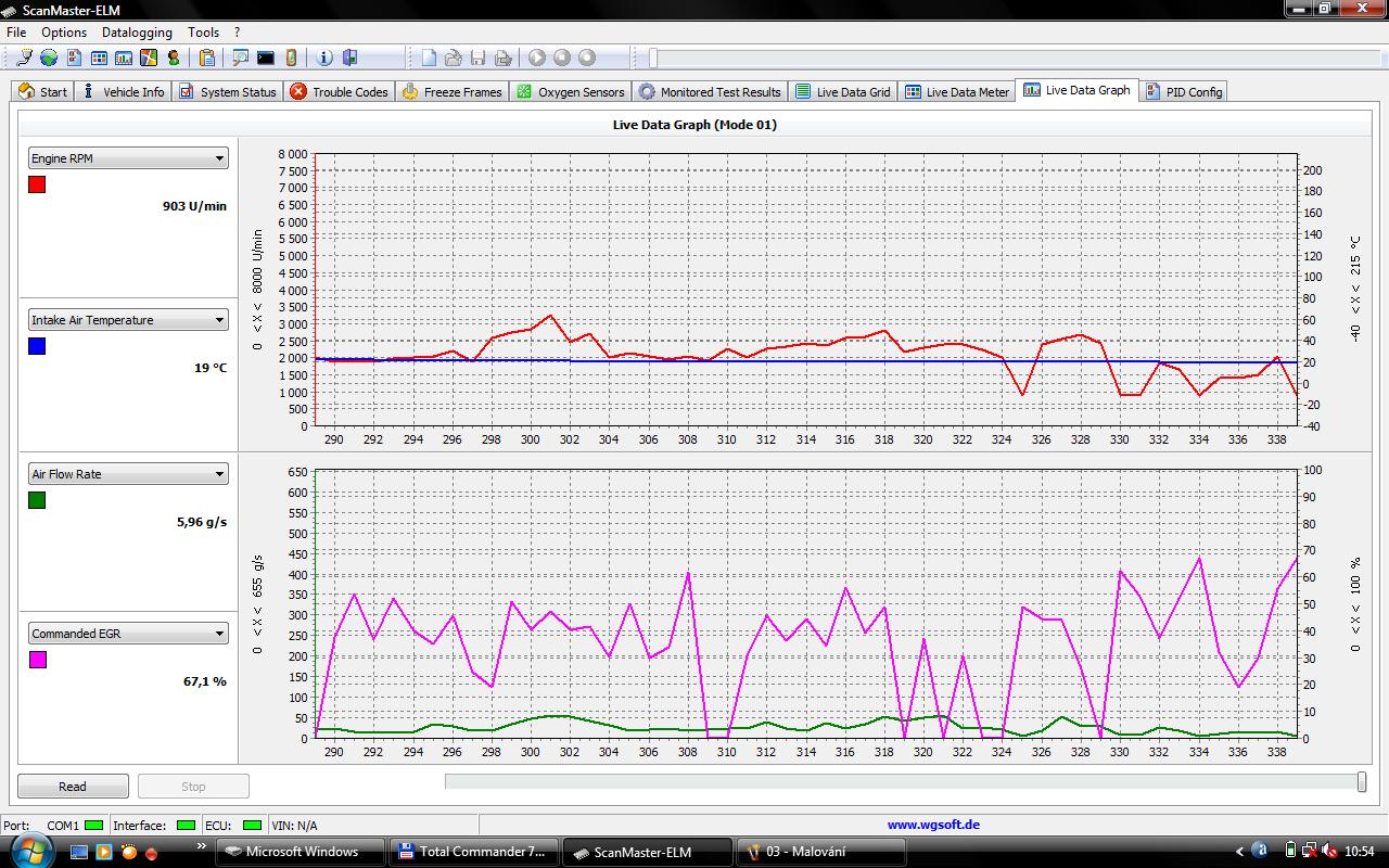 Tady je graf z cca 10km jízdy, trošku ostřejší, aby bylo vidět jak se hýbou hodnoty. Pokud tomu někdo rozumí, ať se prosím vyjádří. Zdá se mi že váha ukazuje malý hodnoty. Maximum kolem 50g/s se mi zdá málo.