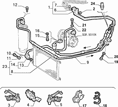 ta hadice vede z filtru(c.15), co je vlevo pred nadobkou ostrikovacu do chladice (kondenzatoru) klimatizace