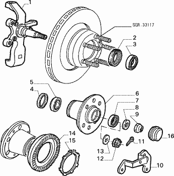 Blbec 6 normálně vyrazíš z kotouče, potom co vyšroubuješ dva šroubky(na šroubovák) co prochází kotoučem, u těhlice je gufero (jde normálně koupit)V blbci 6 jsou naraženy vnější kroužky kuželíkovejch ložisek z obou stran (jdou blbě vyrážet). Ložiska má komplet Kůrkyn. Zachránit musíš jenom matici,podložku a blbec 6. Vše ostatní šrot.