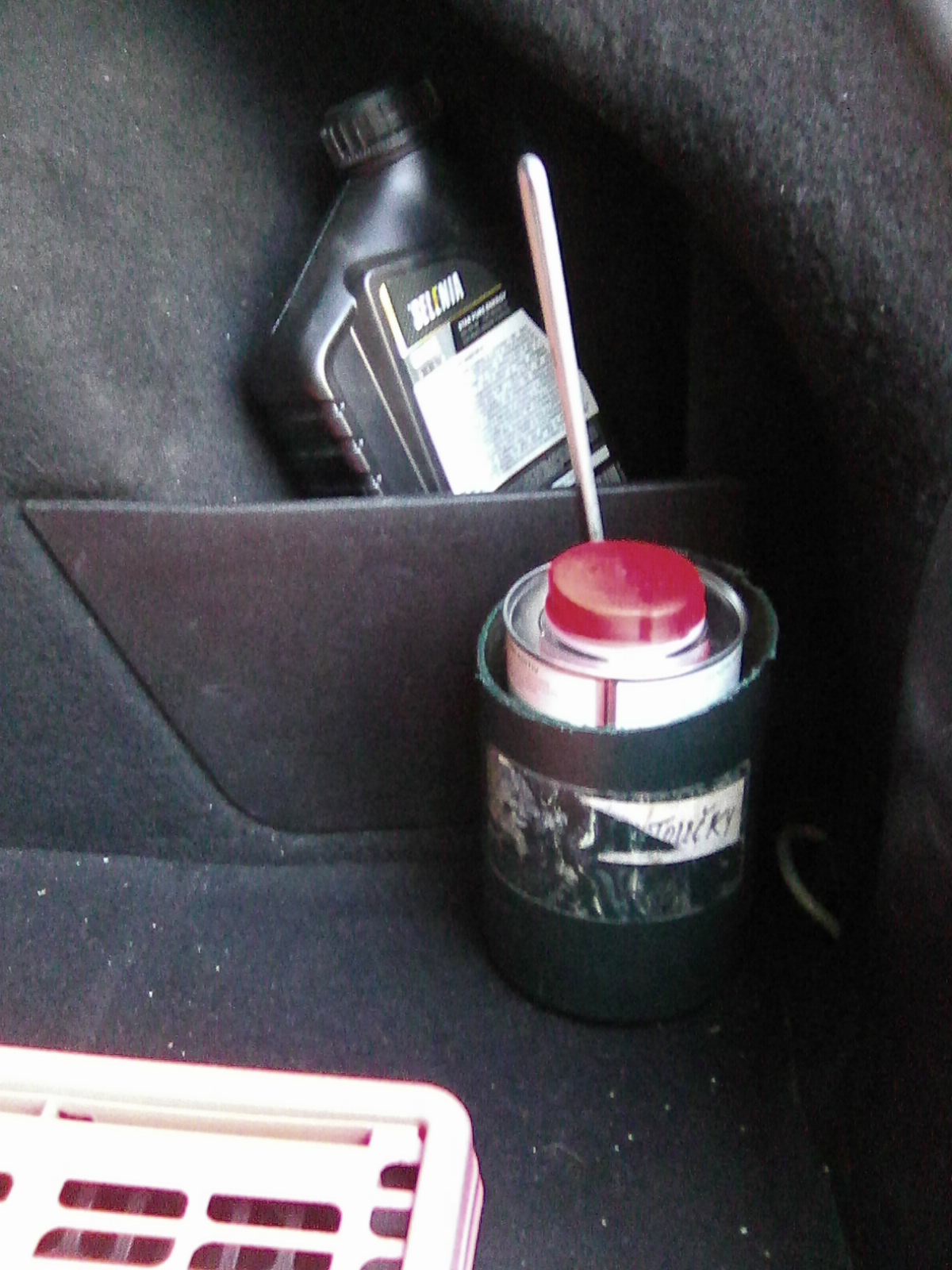 Tak jsem si už leta myslel, že nikdy nebudu muset řešit kam s nějakou plechovkou či plastem například olej do dvoutaktních motorů do Trabíka ( což taky nebylo kam dát) No a stačilo distribuovat "zelený"benzín E10 a vše je zas zpět.Chci alespon částečně mírnit nedobré vlastnosti tohoto benzínu...začal jsem dolívat VIF. No a kam s plechovkou s VIFem? Jen tak to nechat lítat po kufru? Prozatímní řešení je plastová nádobka připevněná ke kapse v kufru drátem ohnutým do uzkého "V".Jako nějak se to drží tam kde má, ale musím vymyslet něco jiného....nebo máte nějaký nápad co už funguje?