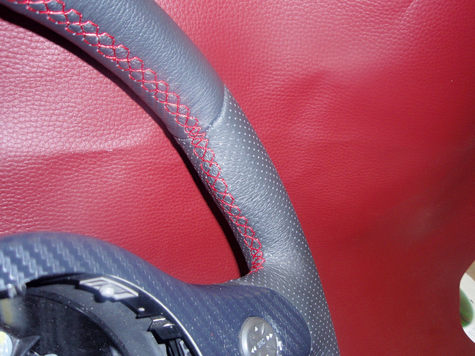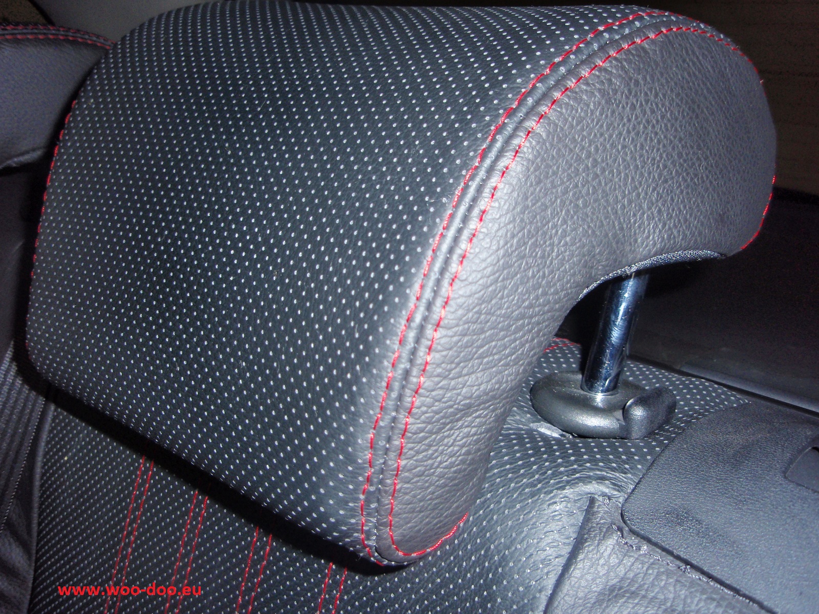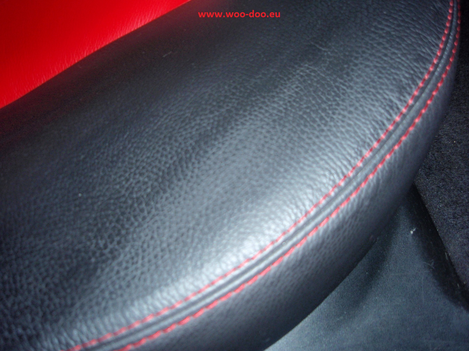 A tak vzhledem k předchozím úpravám tapecu a sedačky k tomu sedí i ten spodek volantu v červené kůži - to už bych v danou chvíli neřešil. Všechno je to otázka osobního vkusu a pokud se ti líbí výrazná rudá v interiéru v kombinaci s karbonem, tak není problém a nenech se odradit. Já bych spíš upozornil na opravdu špičkovou práci při obšití volantu, to jsem fakt nečekal. Až to své kormidlo trochu ohmatám, tak bych do toho šel taky - samo bez té červené, ale kombinace perforovaná a hladká kůže, obšití a přechody, to je fakt luxus.