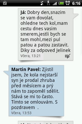 Jak se s ním mám dohodnout?Telefony nebere,na maily ani zprávy nereaguje.Zde je inzerát a screenshot mobilu.Zajímavé je že v úterý 13.11.jsem kola viděl a v sms mě píše že už je měsíc nemá.