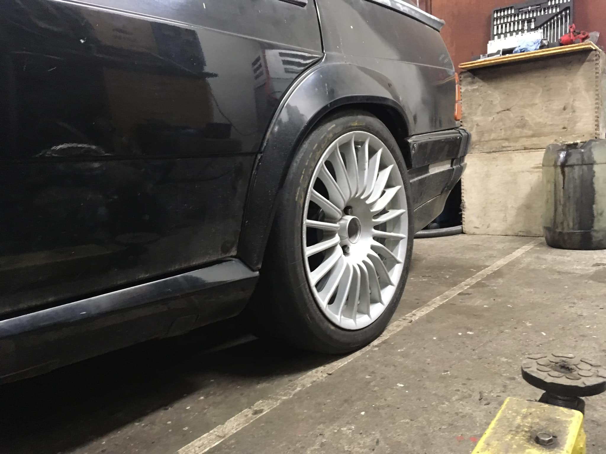 Alfa má už brzdy a spojku odvzdušněné. Stojí konečně na svých. Opičí převod na řazení vytuněn co dům dal. Zadní lemy budu muset trochu vytáhnout, aby to při propružení neškrtlo o ostrou hranu. Vepředu to bude horší. Při rejdu mi už kolo drhne o prah a o příčku mezi podběhem a kabinou ( dáno průměrem Slicku 610mm a šířkou 235mm). Konec prahu půjde uřezat a příčce zkusím domluvit kladivem :smt021.