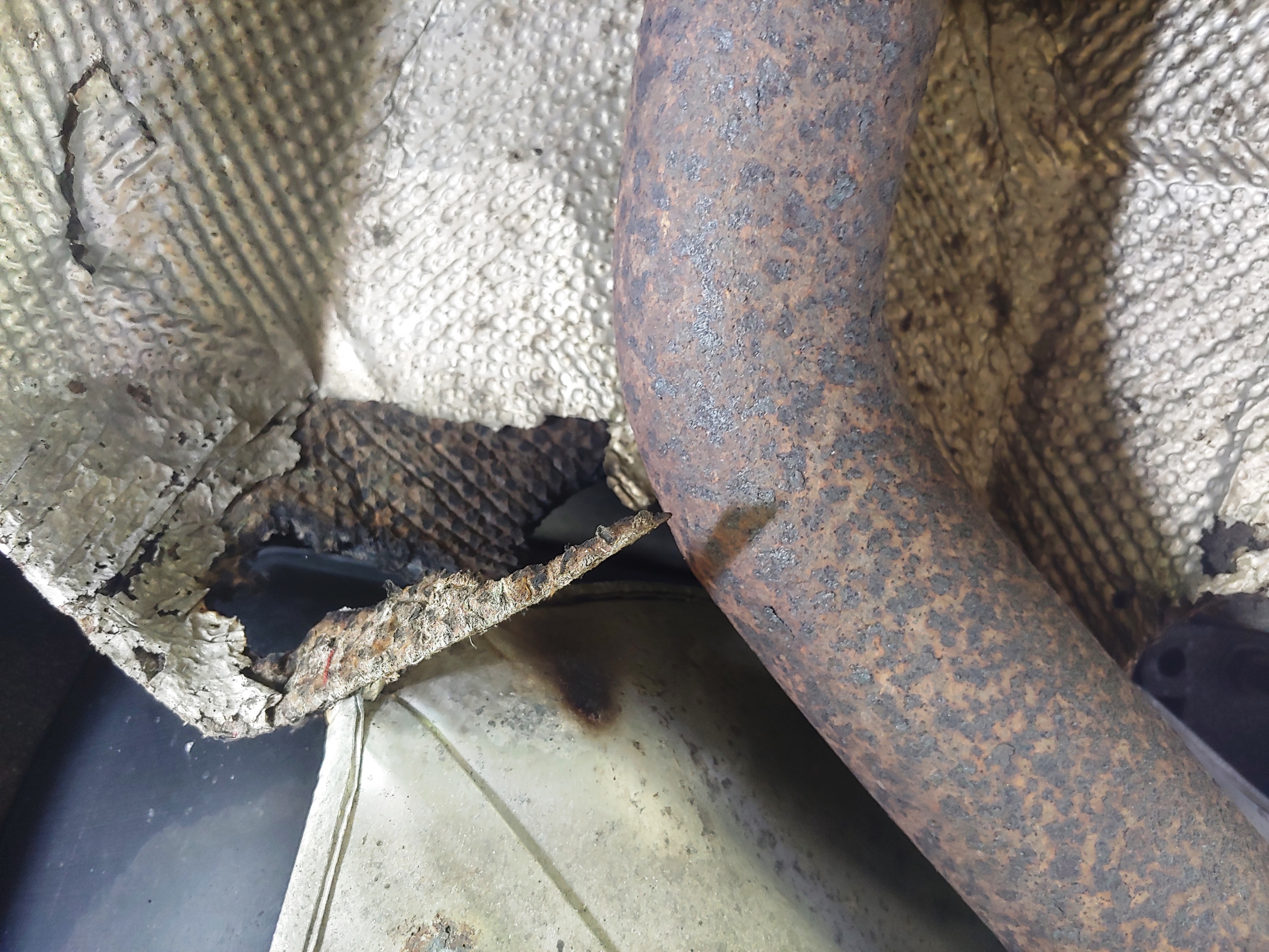 A ted proc se to stalo: okolo vyfuku je tepelne stineni a u nadrze velky plech. Drzaky toho plechu jsou plastove a po tech letech a najezdu (14let, 310tis km) to uz nevydrzel a zkroutil se. Takze plech pekne lehnul na vyfuk a sebou vzal tepelnou izolaci okolo vyfuku. No a ta izolace mi zacala horet.
