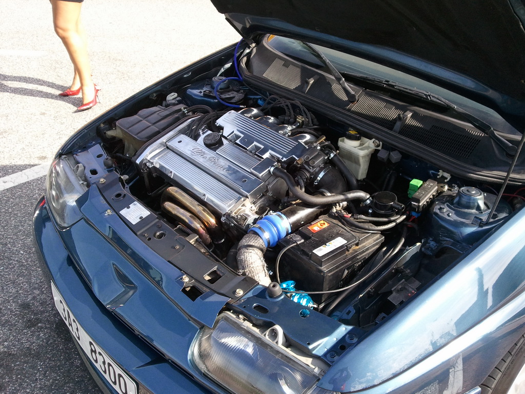 Tady jsou nějaké fotky a nějaká ta specifikace a shrnutí úprav pro letošní rok: Motor - původně 1,4 16V TS 103PS, komplet zástavba motoru Lampredi T16 - 2.0 16V Turbo z Fiatu Coupe včetně hnacího ústrojí, chladícího okruhu a elektroinstalace. Kompletní GO motoru - kliková hřídel A1, zesílená třívrstvá ojniční ložiska, nová hlavní ložiska + šrouby, repasované olejové čerpadlo, komplet nová gufera a těsnění, odstraněné vyvažovací hřídele + zaslepení mazacích kanálů, kované "H" ojnice EF Racing, ojniční šrouby ARP, výbrus válců, lehčí kované výbrusové písty Wossner 84,2mm, silnější hlavové šrouby M12 pevnost 12.9 (série M10, pevnost 10) - převrtání otvorů v hlavě na 12,2mm a v bloku + vyřezání nových závitů, pětivrstvé kovové těsnění pod hlavu Cometic, úprava hlavy válců - zvětšené sací a výfukové kanály + spasování se sacím a výfukovým potrubím, úprava ventilových pružin pro zdvih ventilu 12mm, bronzová vodítka ventilů, úprava tvaru ventilových sedel a ventilů + leštění, zabroušené ventily, vyleštění spalovacích prostorů v hlavě a napojení na ventilová sedla, seřízení ventilové vůle IN/EX + nová gufera, vstřiky RC Racing 750cc, výkonnější palivová pumpa Walbro 255 + úprava napájení, stavitelná kola vačkových hřídelů, laděné nerez svody, velké turbo Garett se zesílenými axiálními ložisky, zakázkové vyrobené nerezové výfukové potrubí o průměru 2,5" s koncovým tlumičem ProRacing, větší IC, zakázkově vyrobený nerezový rozvod vzduchu k turbu a IC od Falcon Racing, BOV kopie Greddy RS, keramická lamela Rensport, odlehčený a vyvážený setrvačník, elektronická regulace tlaku turba Apexi, monitoring motoru VDO a BSR. Výkon 273PS, točivý moment 389Nm při plnícím tlaku 0,85 Bar.