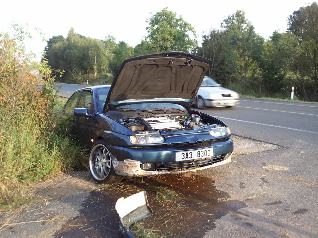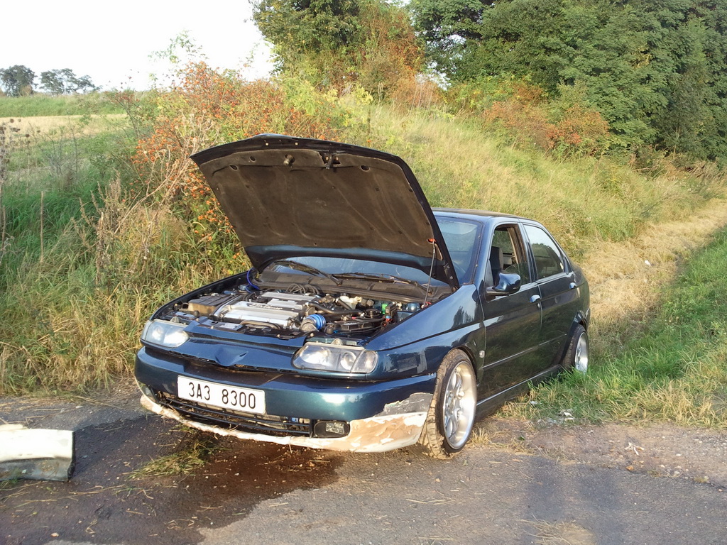 Rychlost okolo 100 - 110km/h, silnice E16 mezi Mladou Boleslaví a Jičínem směr Praha. V sbíháni dvou pruhů v jeden jsem si díky slunci které mě oslňovalo nevšiml značky zúžení (které mimochodem nastalo pouhých cca 20-30m za značkou) a po předjetí několika aut jsem se vrátil do pravého pruhu, následovala levotočivá zatáčka a já byl v tu dobu na úrovni předních dveří kamarádova Golfu V GTI takže jsem ani nemohl vidět že se pruhy zúžují. Když jsem to viděl bylo už pozdě - lekl jsem se, prudce jsem šlápl na brzdu a jelikož to bylo jak jsem již psal v zatáčce, tak jsem dostal lehký smyk, drcnul jsem do kamarádova Golfa a ten mě odrazil do škarpy, tu jsem celou proletěl a skončil jsem takhle. Následky může každý posoudit sám...