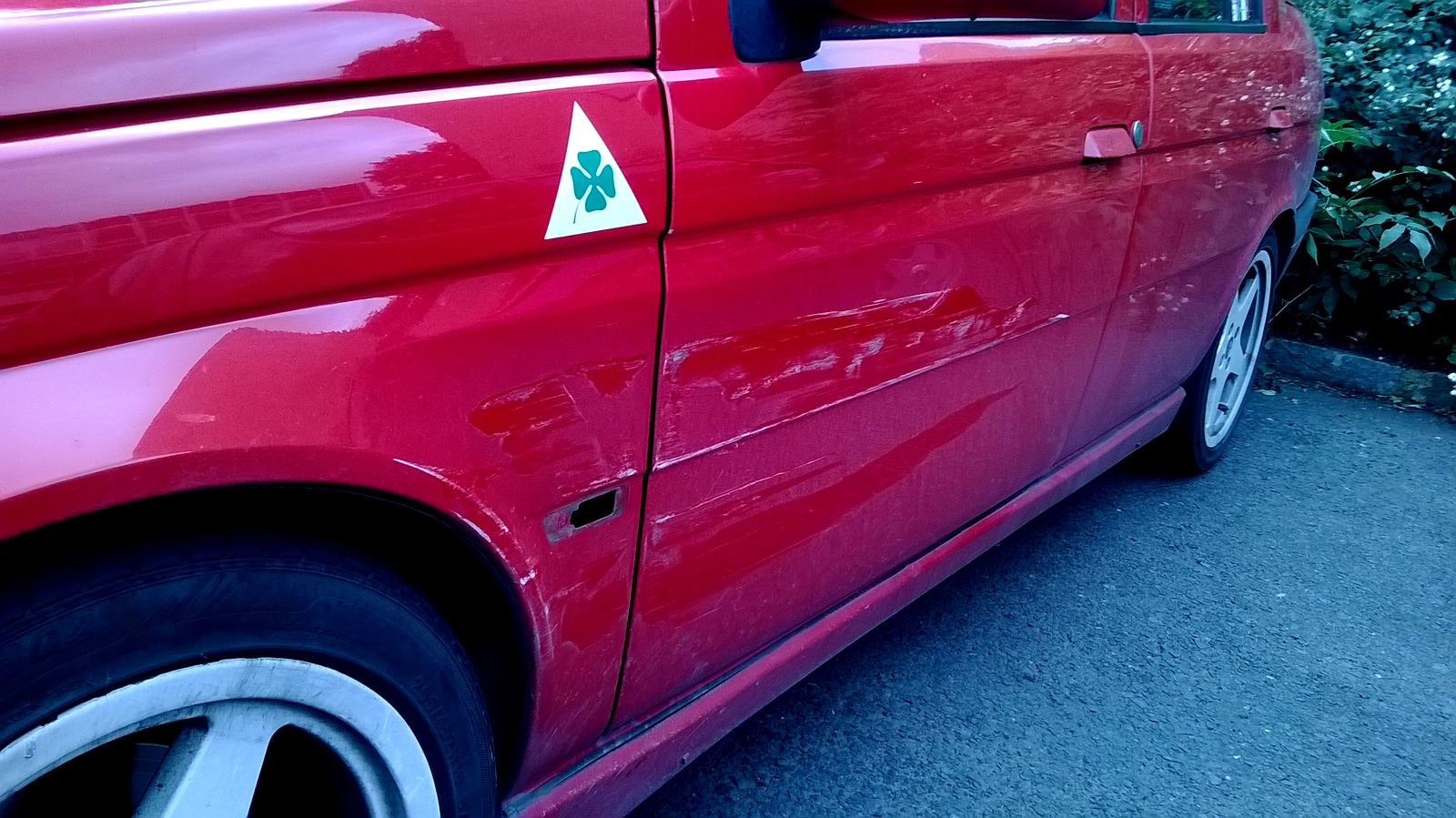 Já už na to nemám slov.. Když jsem jezdil obouchanou benzínovou 155, která hrála všema barvama, tak mě nikdy nikdo neškrtl a teď, když mám nádhernou Žehličku, tak nejdřív sejmu srnku a včera tohle.. To musel bejt totální idiot, nikdo jinej snad nedokáže udělat víc jak metrovou čáru.. No nic, od včerejška namátkově u nás procházím parkoviště, někdo se snad bude jednou divit..