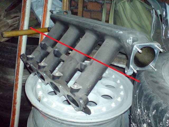 O tom sání z 16vt uvažuju, protože bych mohl mít za dobrou cenu. Když by se uřízlo přibližně jak je označeno na obrázku a připevnilo na ten mezikus z TSka, tak by to mohlo fungovat. Akorát nevím jaká je rozteč jednotlivých výstupů...
