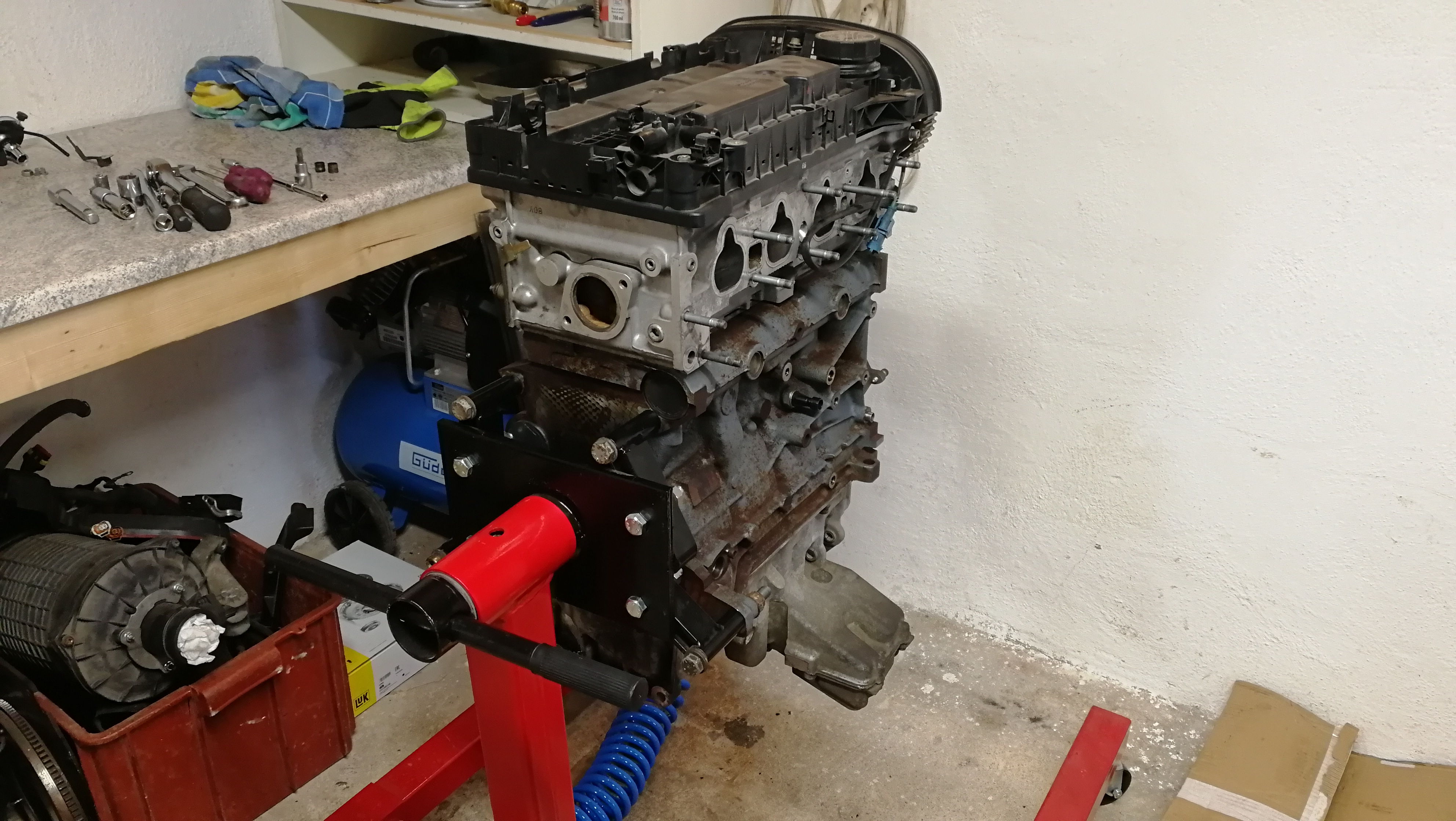 Už to jde do finále, motor je složenej, převodovka taky nachystaná a může to jit do auta. Jelikož nemám žirafu, musím najít nějakej příprc, abysme ho tam napasovali.