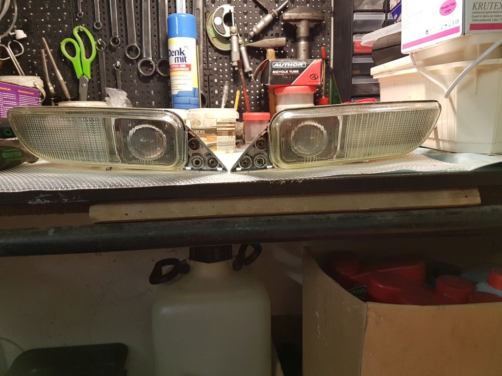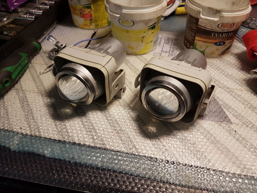 Takhle vypadaly ty puvodni, klasicky vypalena parabola: Odstranil jsem streva a nechal jen ty ramy, do kterych jsem osadil univerzalni mlhovky, ktere do tech otvoru sedly na chlup presne (jen jsem jim musel trochu pomoct bruskou). Vyhoda je, ze zustala zachovana mechanika naklapeni: A takhle ted sviti. Ty odrazy nahore jsou nejspis z te obnovene chromove vrstvy, co jsem daval delat naposled se svetlomety: