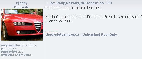 měl jsem sedana a potřeboval jsem o něco větší auto a alfa se mi hrozně líbí, tak doufám že vydrží, jinak tohle je můj pašík, teď někde brázdí silnice u Brna s novým majitelem, jinak alfinu mám zatím origo stav, minulý týden jsem ji dotáhnul z Itálie, takže pro mě novota, ale máme tu zaje.... naftu, protože mi začíná s houpáním otáček, což v Itálii nebylo, ale to snad vyřešímReznikCZ píše:koukám do podpisu . .Co že jsi vyměnil Passata za 159? . .mimochodem taky jsem měl s Egr ventilem problém ale na 159cendler píše:pžezuto, bohužel dovezeno na letných