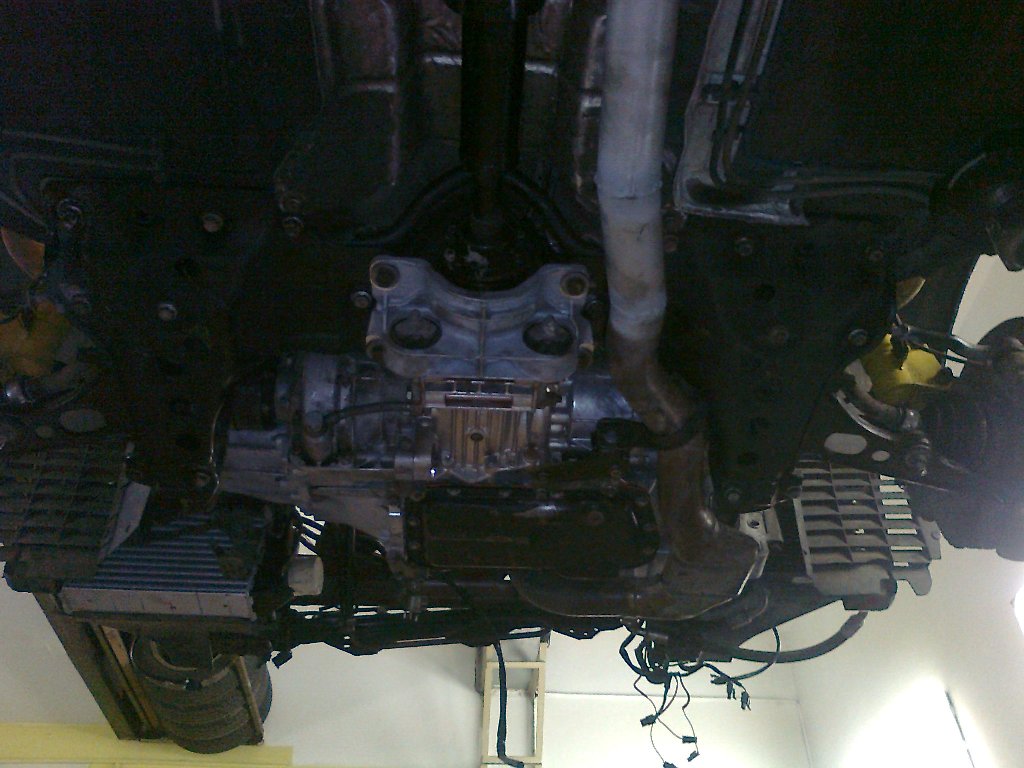 Moc se mu tam nechtělo ale nakonec se to povedlo. Takže co se spodku týče vše je na svém místě poloosy,kardan,diferák,výfuk,převodovka-prostě spodek zadělanej auto je na kolech zase zpátky u mě v garáži kde už se dotvoří zbytek.