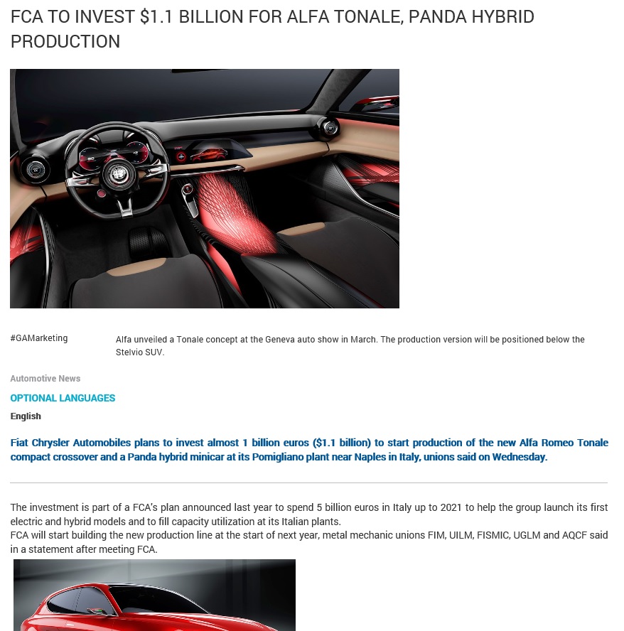 Dle posledních informací, hodlá FCA zainvestovat 1,1 miliardy dolarů, aby mohla spustit výrobu Alfy Romeo Tonale a nového Fiatu Panda. Obě auta budou disponovat hybridní technologií pohonu. V Pomiglianu se již připravují výrobní prostory. Dávám sem částečný printscreen z našeho firemního newsletteru