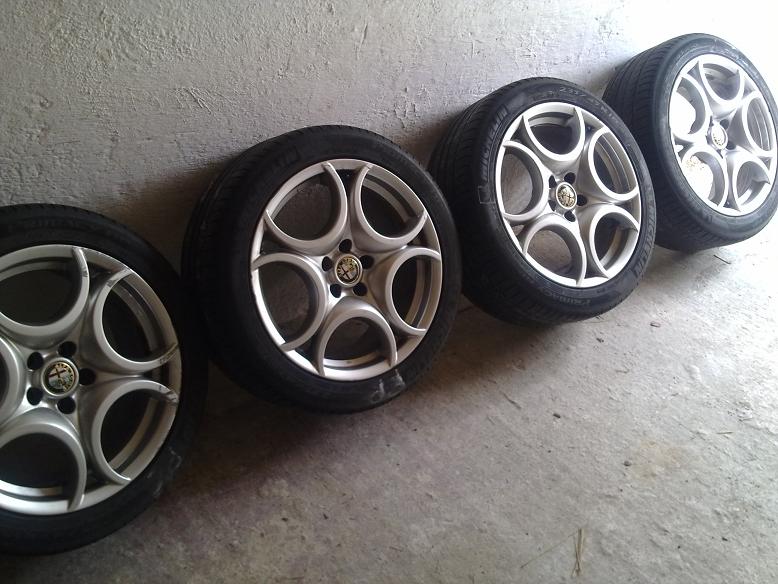 - zakoupeny komplet nová kola styl audi R8, které tam krásně padnou, v provedení bílé lakování + leštěné čelní plochy rozměr 8x19 ET30 a pneumatiky ve správné rozměru pro pojišťovnu 235/40/19, přelakovány třmeny brzd, protože to bylo omlácené, jak jsem zase zkoušel různá kola a žádná tam nešly