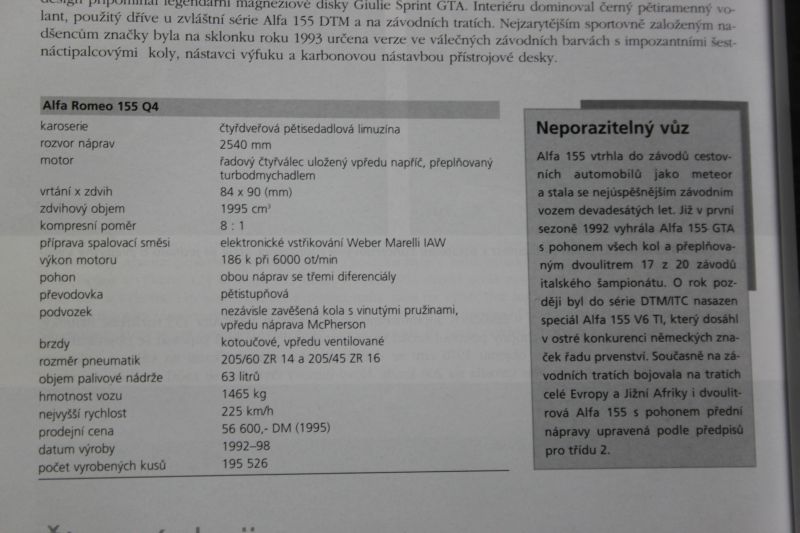 porovnání....Doslova brutální pak byla verze Alfa Romeo 155 GTA (viz článek), u níž se konstruktéři zcela oprostili od oněch kompromisů ve prospěch komfortu a zůstal jen syrový supersport zrychlující z 0 na 100 km/h za 5,5 s a zvládnuvší kilometr s pevným startem za pouhých 24,6 s. Důved byl zřejmý – homologace pro šampionát C.I.V.T., jehož se AR 155 GTA stala ihned v roce 1993 neohrozitelným vládcem…