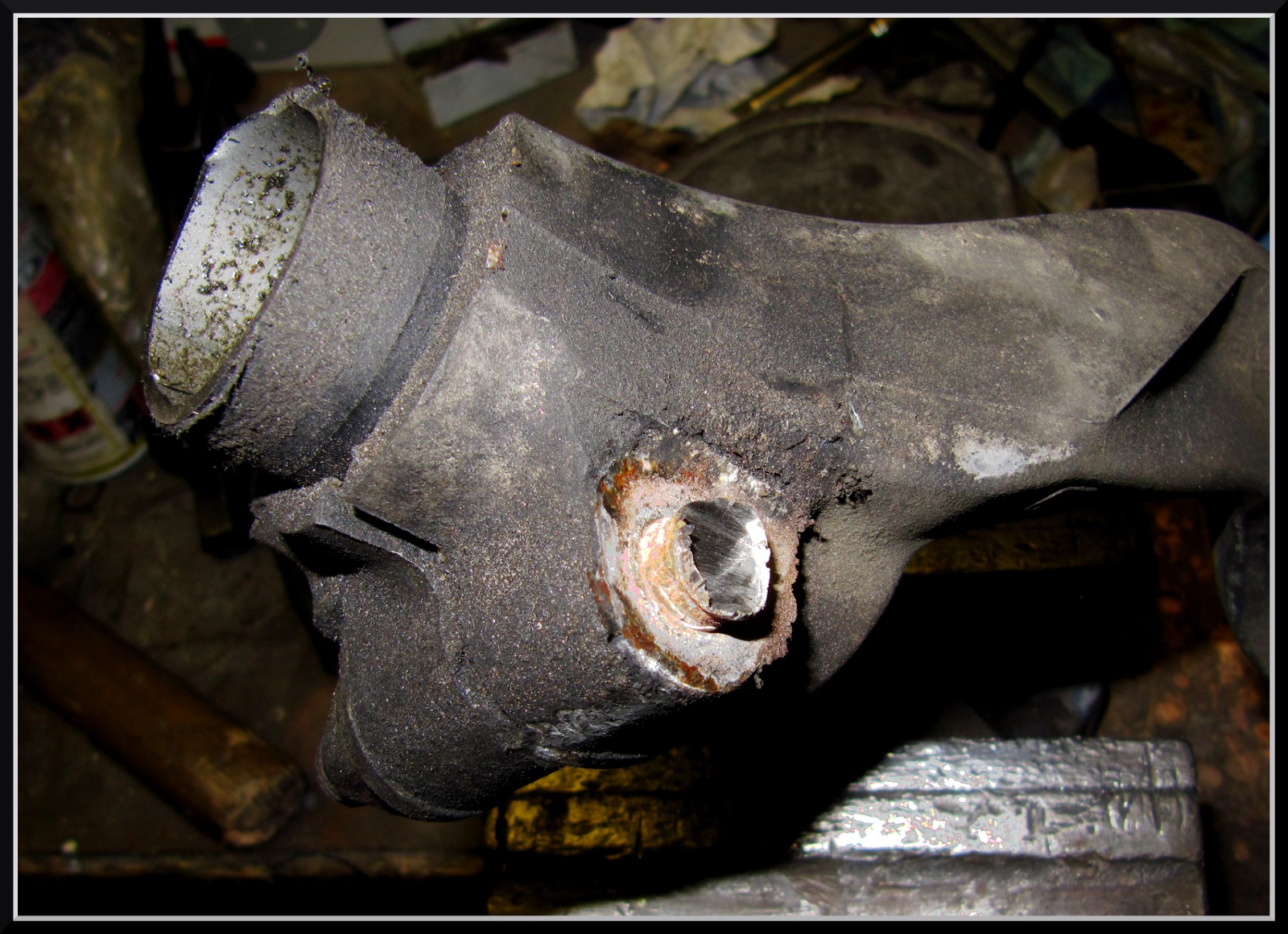 Fotku konkrétně tý matky nemám,mohla by bejt trošku vidět na první fotce.Jak je na tý těhlici taková ta ploška(na druhý fotce směrem nahoru)tak tam přesně pasuje ta matka,tudíž sní nejde točit.Ten zbytek šroubu jsem vymlátil ven tyčkou a palicí. :-)