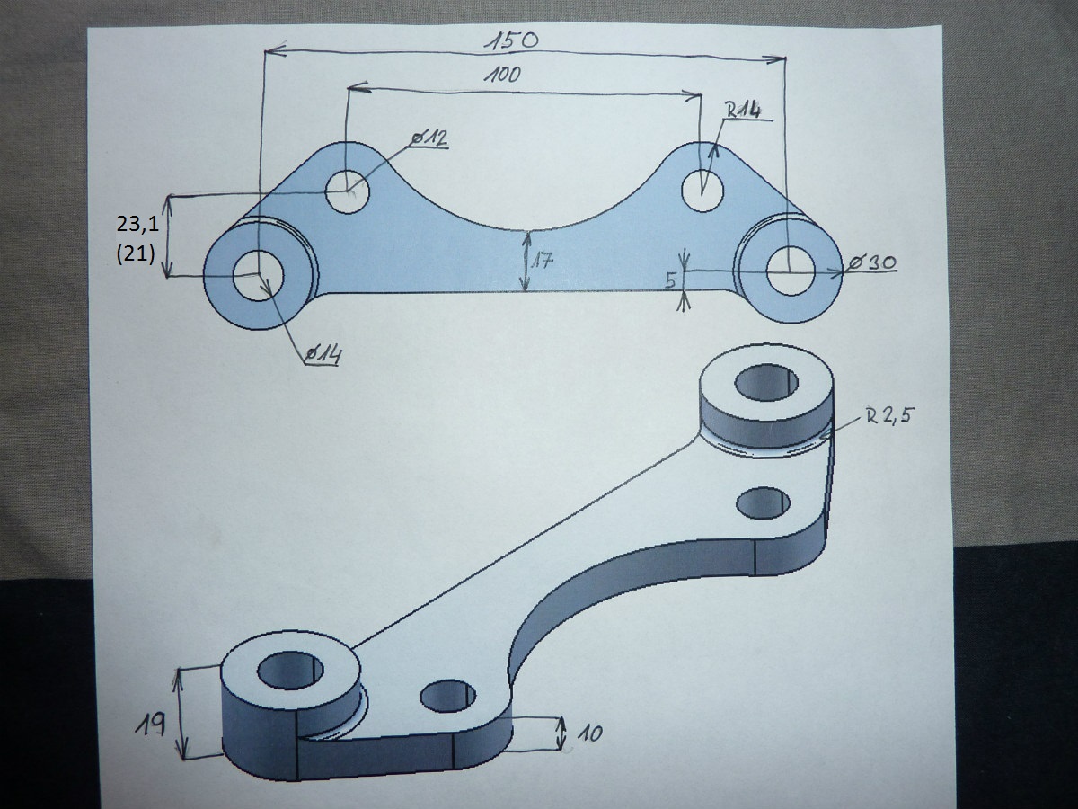 Ahoj, tak jsem to zkusil pro své hraní přemodelovat. Vypadá to, že papír snese všchno a někde je něco jinak. Buď tvůj design ze kterého je obrázek a fotky na začátku vlákna má jiné rozměry, nebo jsem někde něco přehlédl. Prostě mi nevychází tak hluboké vybrání ke kótě 17mm. Šikmé plochy jsou pod jiným úhlem (výrazně). Máš 3D model?perry69 píše:Nějak jsem na to zapoměl, dát se ten výkres. Je to dělané doma od ruky, takže se zdržte komentářů prosím... Kdybych ty redukce dělal dnes, tak bych vzdálenost děr nedělal 14mm, ale stačilo by 12mm. Tím pádem bude brzdič blíž ke středu a možná by se tam ty 16" kola dali dát. (člen Toro tam nenarval 16" Baroka. 166 má asi jiný vnitřní průměr límce disku) Jelikož je kotouč 305mm a brzdič na 310, tak by se tím posunutím vymezilo hluché místo na destičce, která tak o kousíček přesahuje kotouč. Do středu se právě nechá ještě o ty 2mm posunout a furt bude destička na kotouči.