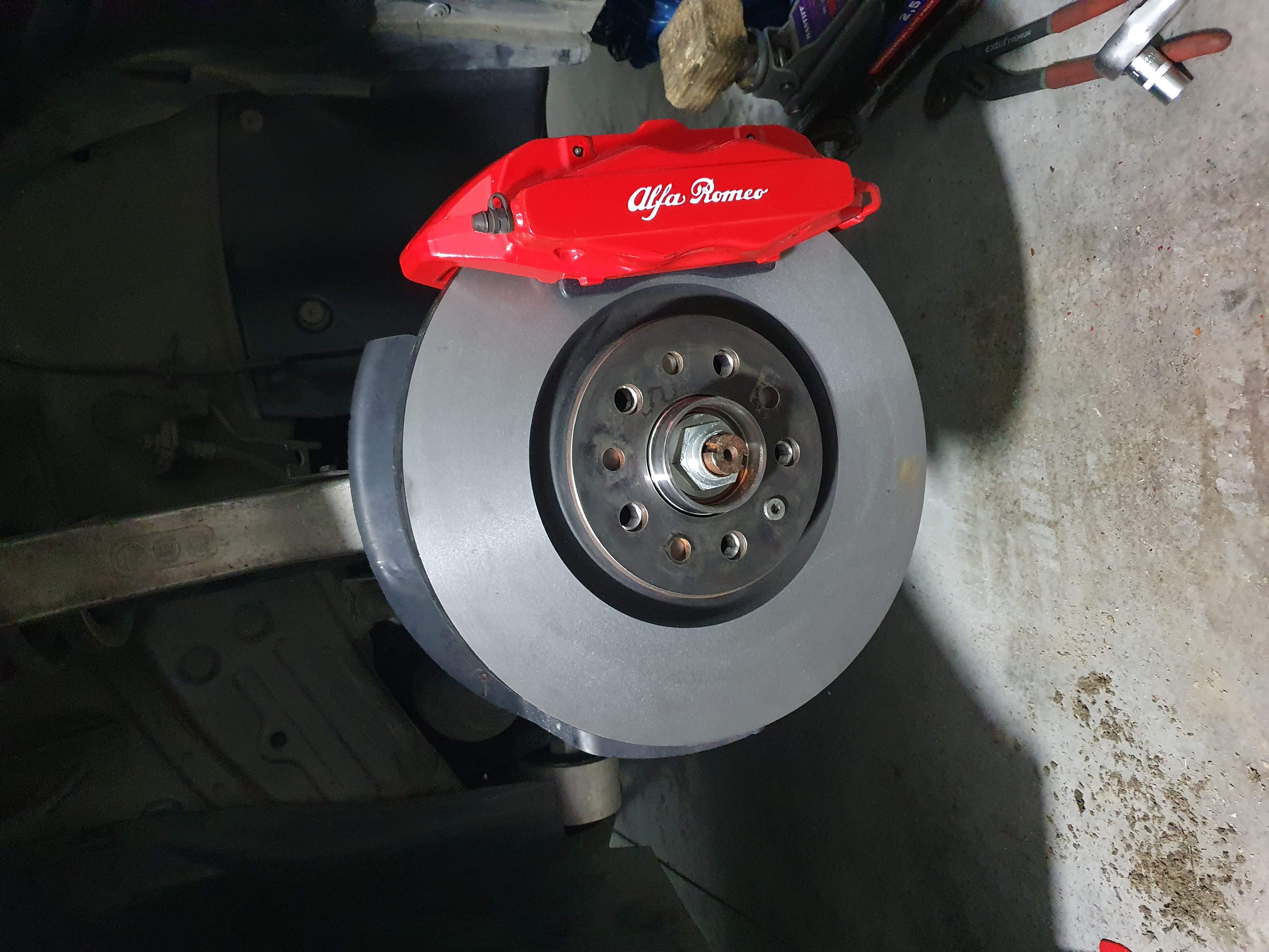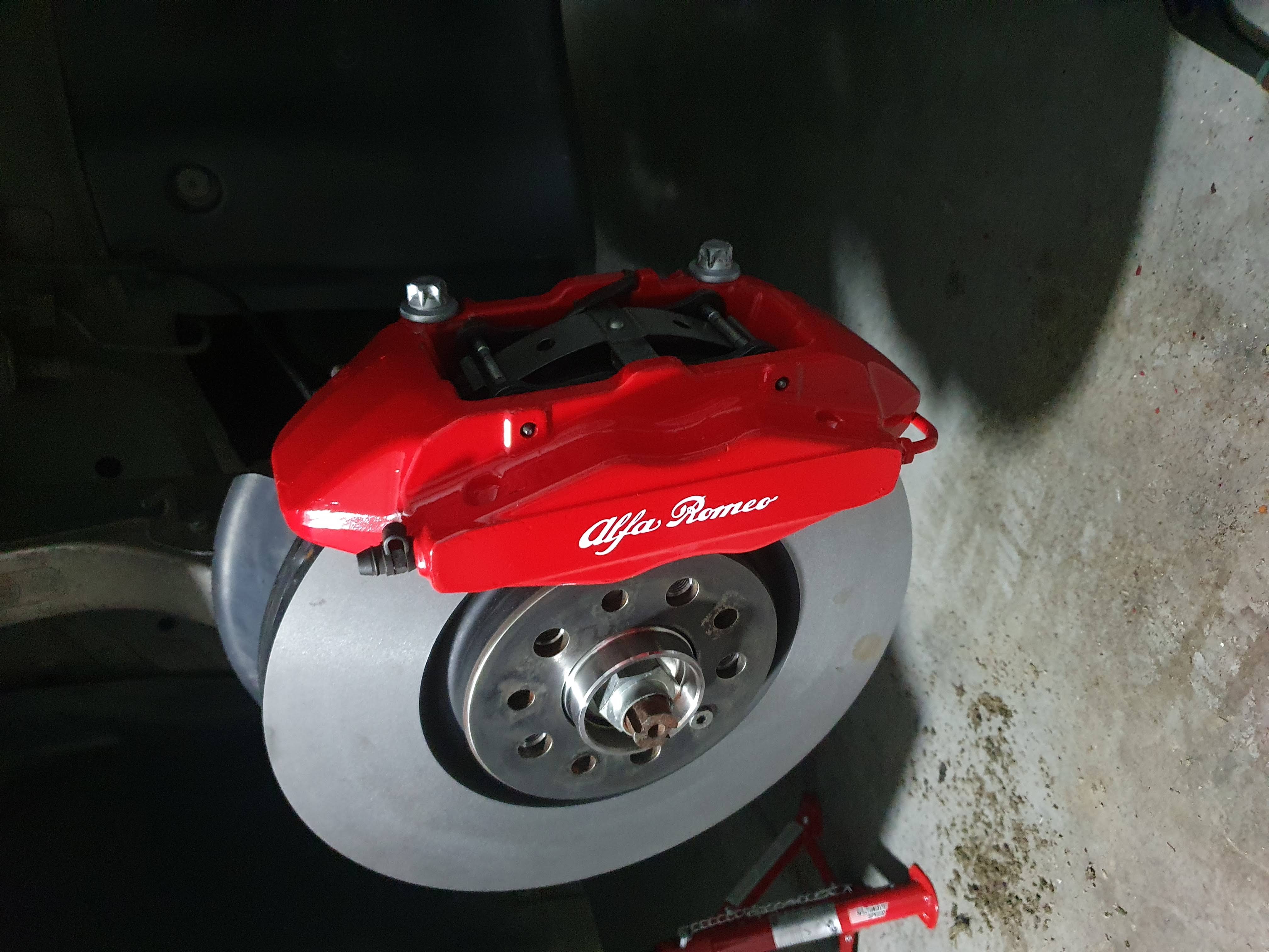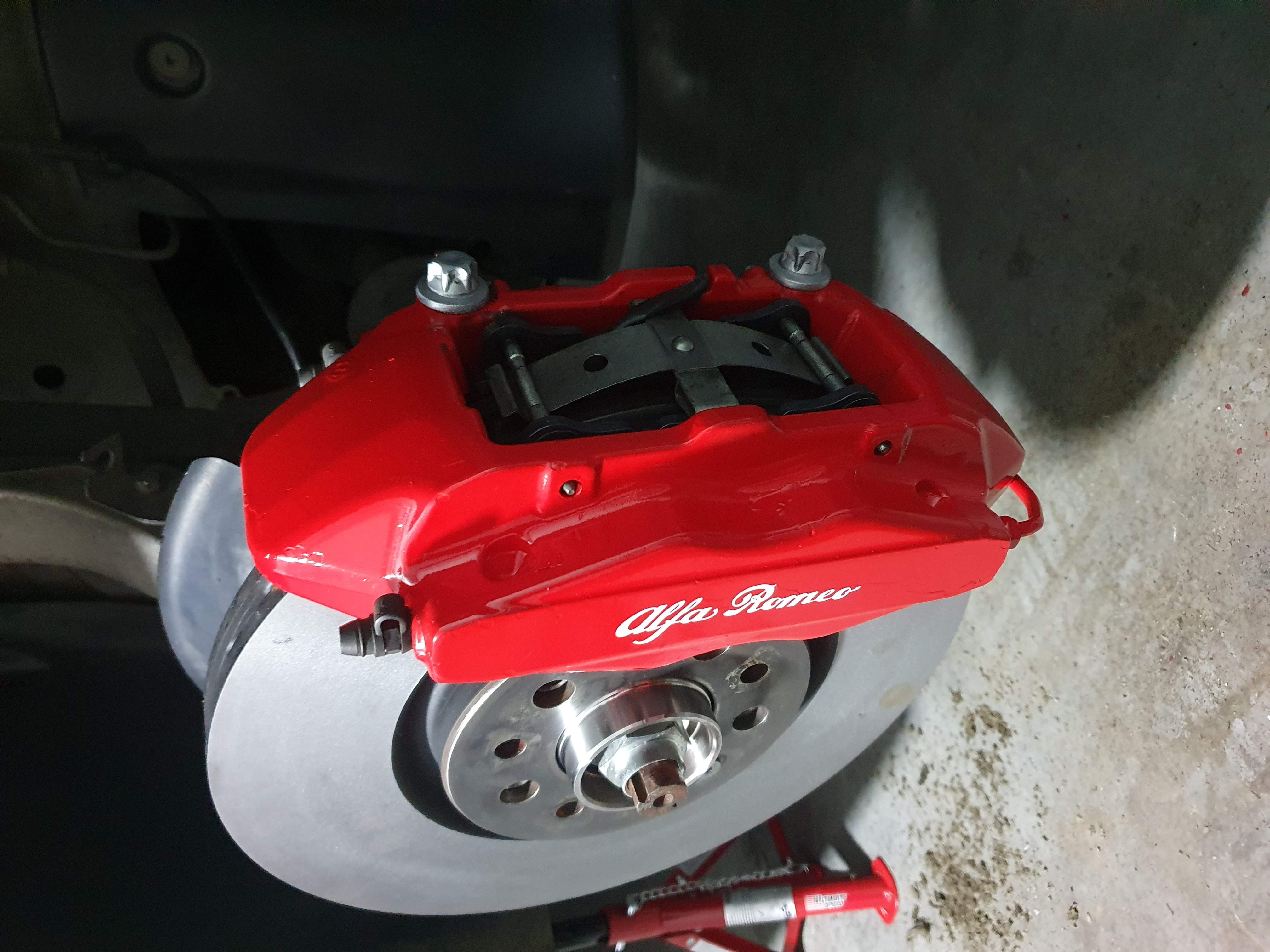 Farba brzdičov v pôvodnom stave už mala svoje odžité a chcel som ešte vymeniť brzdovú kvapalinu a odvzdušniť systém, tak som to zobral troška obšírnejšie. Zadné brzdiče sú v peknom stave, farba dobre drží a nie je opadaná tak teda predné strmene som rozobral, vyčistil, nastriekal, nové nálepky, zalakoval, poskladal a už sa teším na leto kedy v 19" Prodrivoch pekne vyniknú