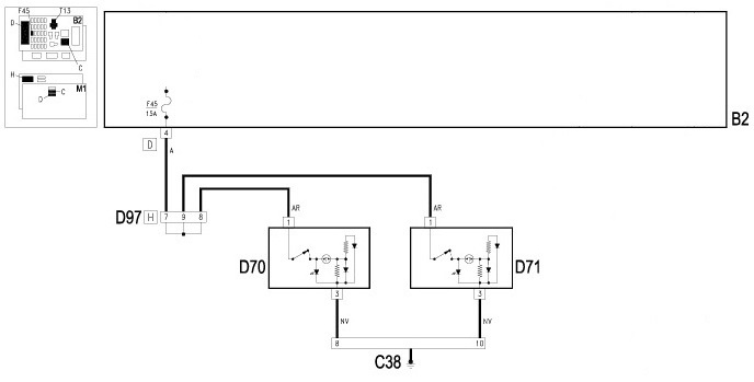 Většinou stačí dotáhnout kabel od B2-4D k sedačkám. D97H je propojka na podlaze (aby jsi netahal 2 kabely od bodycompu) pod sedačkou řidiče a C38 je zem u páky ruční brzdy. Svorkovnice na výhřev mají ale pouze 2 piny!!