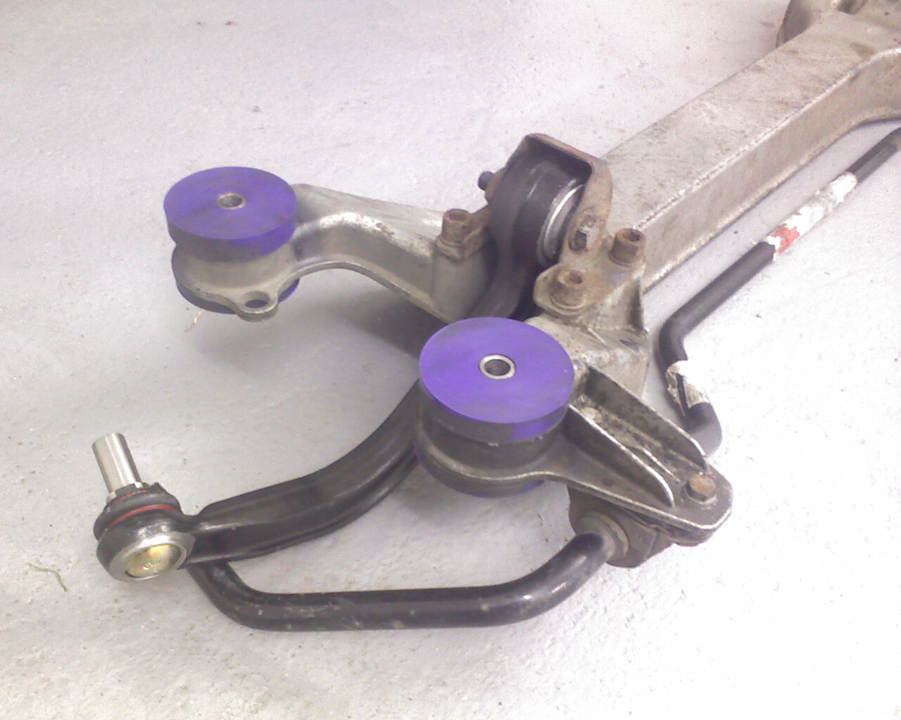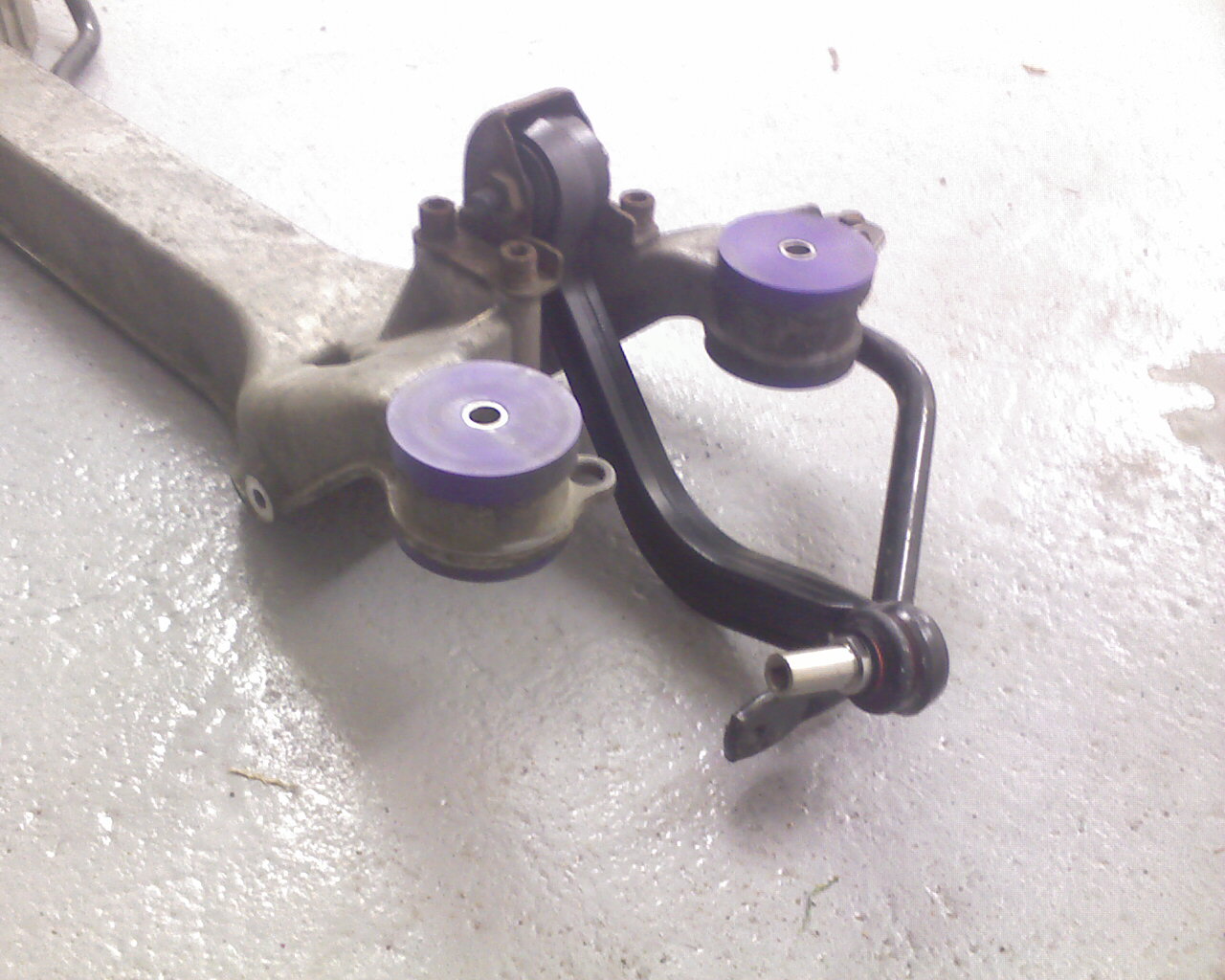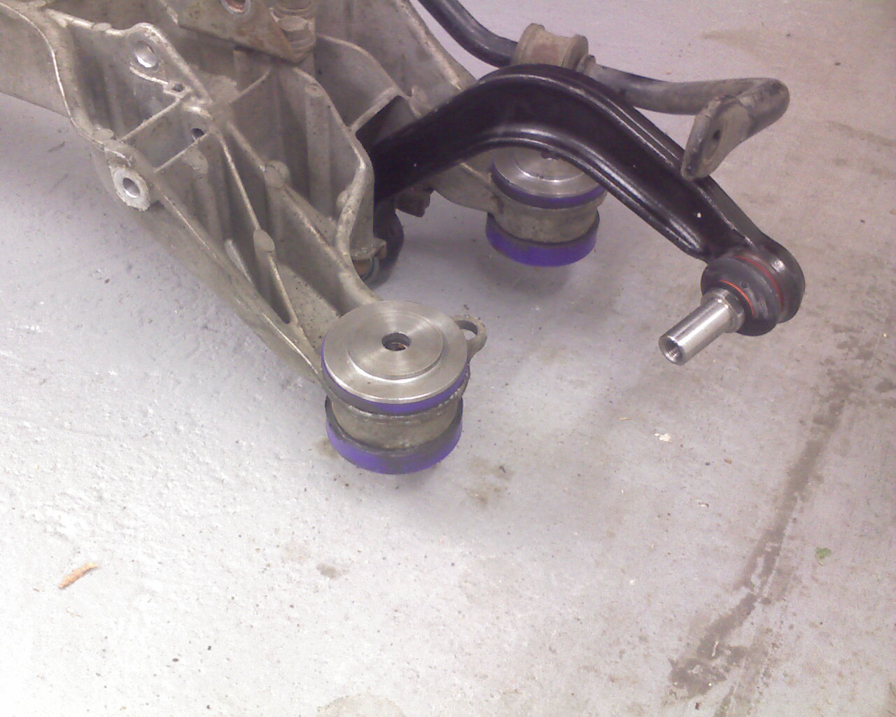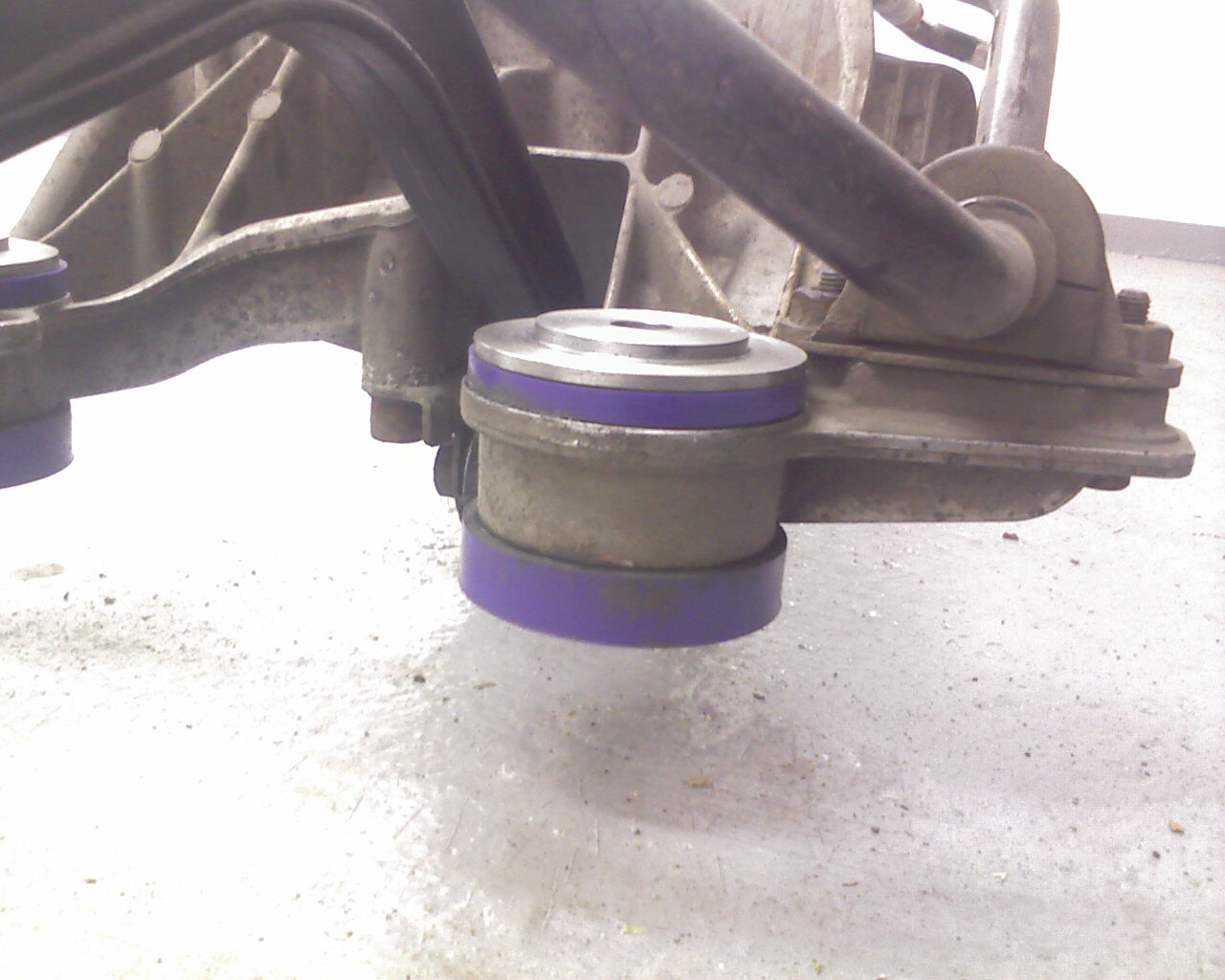 Silentbloky z nápravnice vylisovat tlačením na tu menší podložku silentbloku (od domku bumerangu). Jde to ztuha, ale vylisoval jsem to na lisu za 5K, co dává Kelly nebo Elit u kamaráda v dílně. Most je hliníkovej, lisovat opatrně, nejlépe mít podložené oko, ve kterém je silentblok, vhodným kusem trubky o průměru 67-75 mm.
