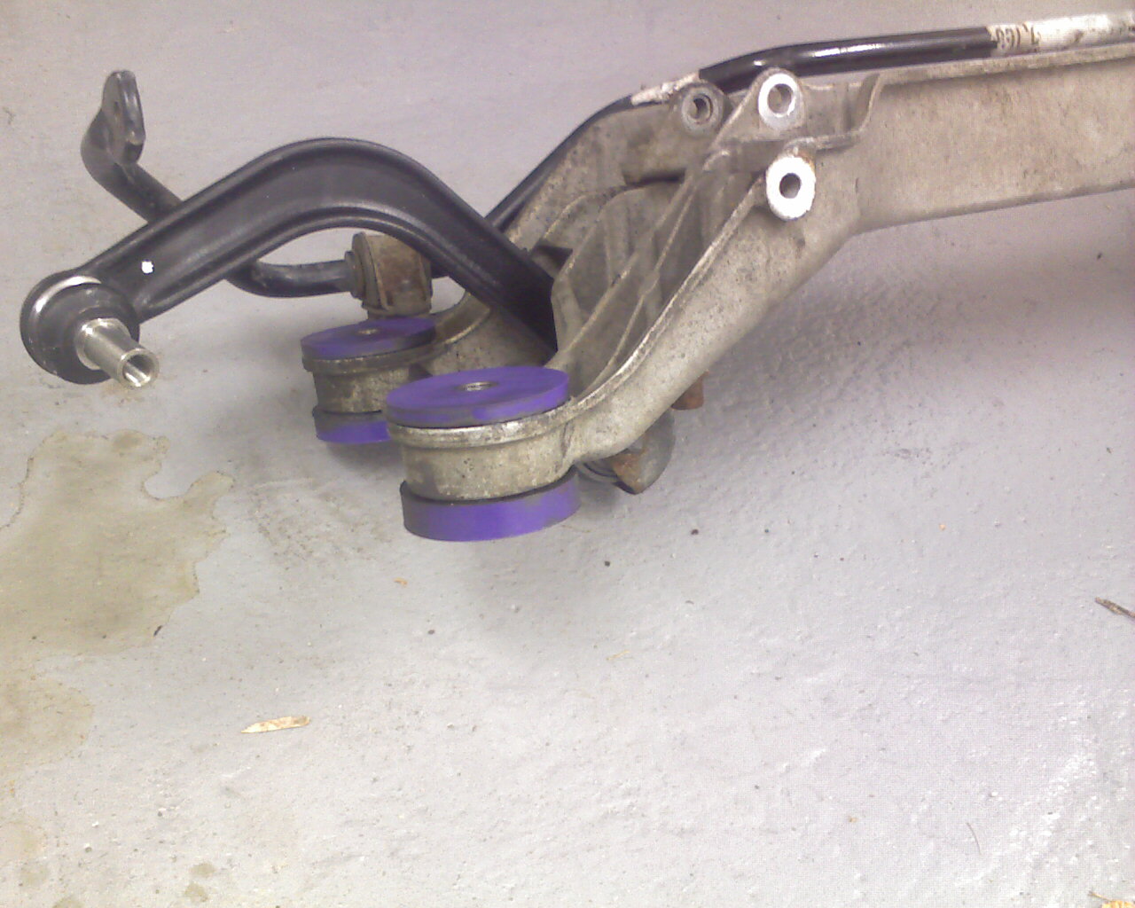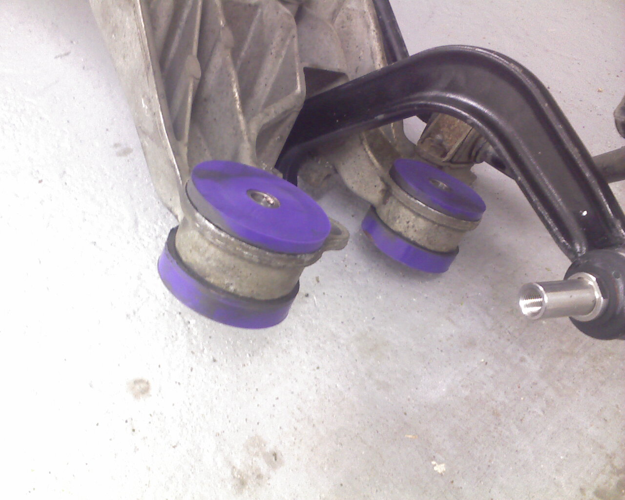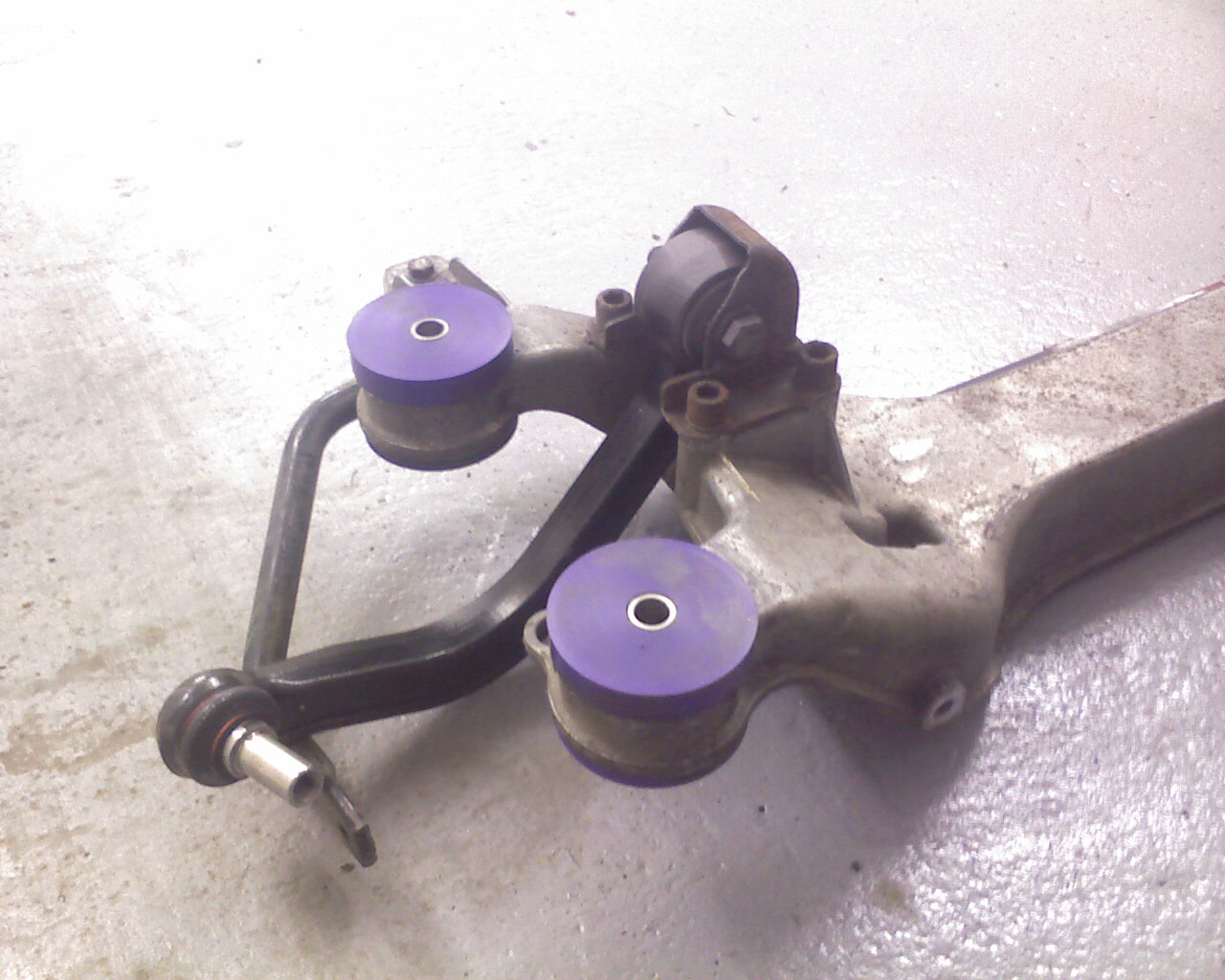 Silentbloky z nápravnice vylisovat tlačením na tu menší podložku silentbloku (od domku bumerangu). Jde to ztuha, ale vylisoval jsem to na lisu za 5K, co dává Kelly nebo Elit u kamaráda v dílně. Most je hliníkovej, lisovat opatrně, nejlépe mít podložené oko, ve kterém je silentblok, vhodným kusem trubky o průměru 67-75 mm.
