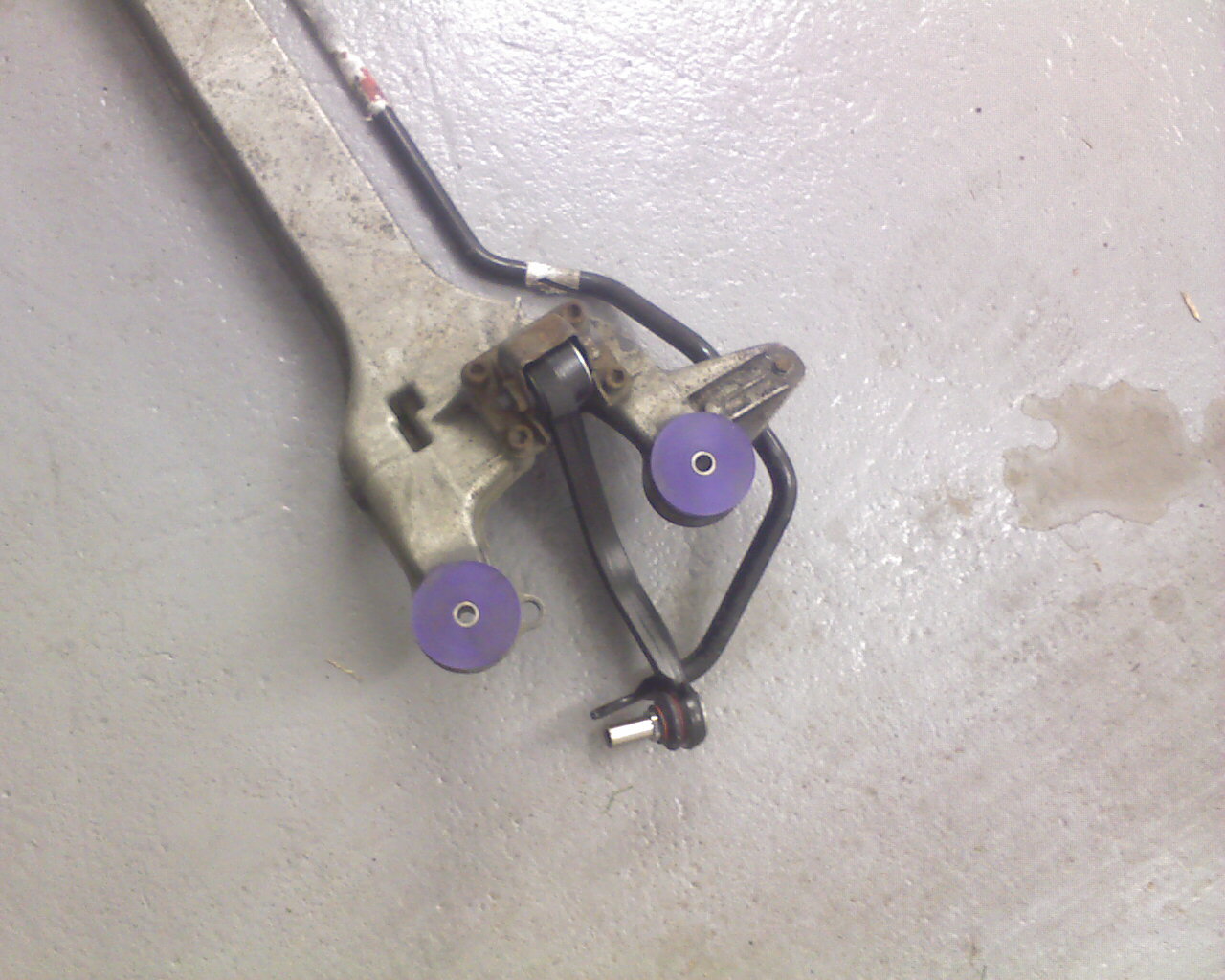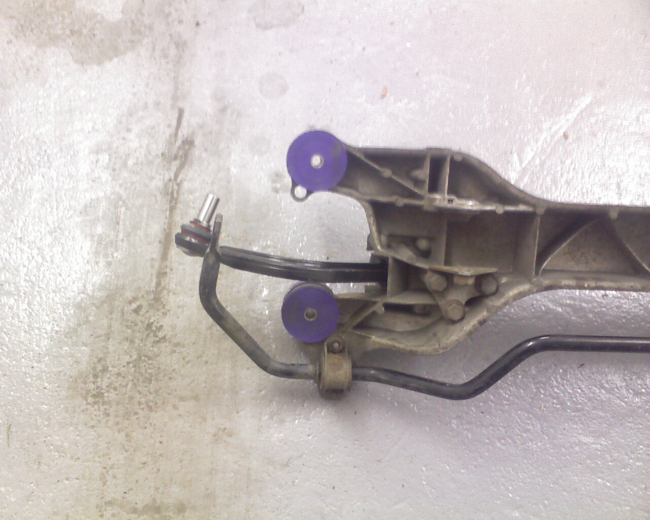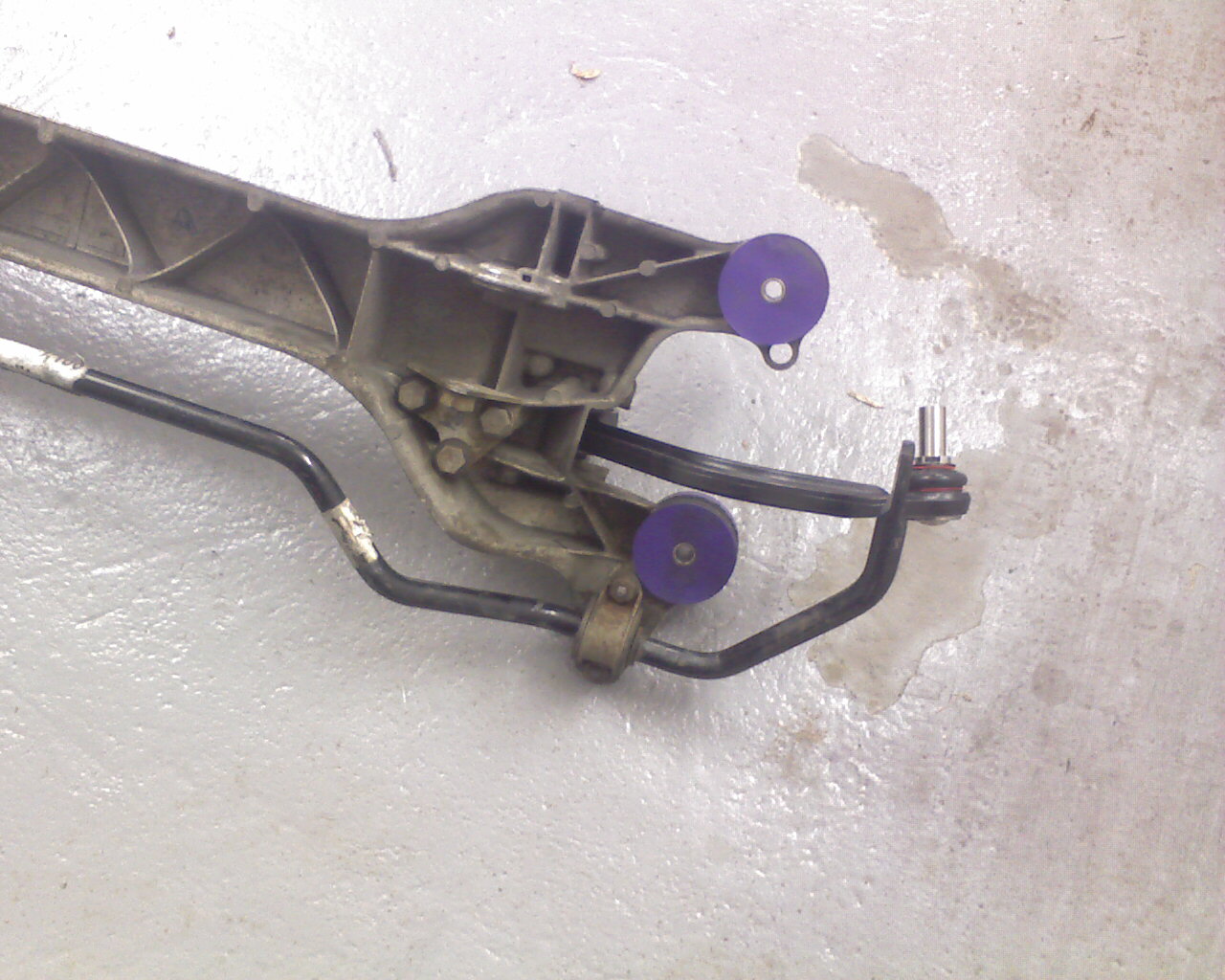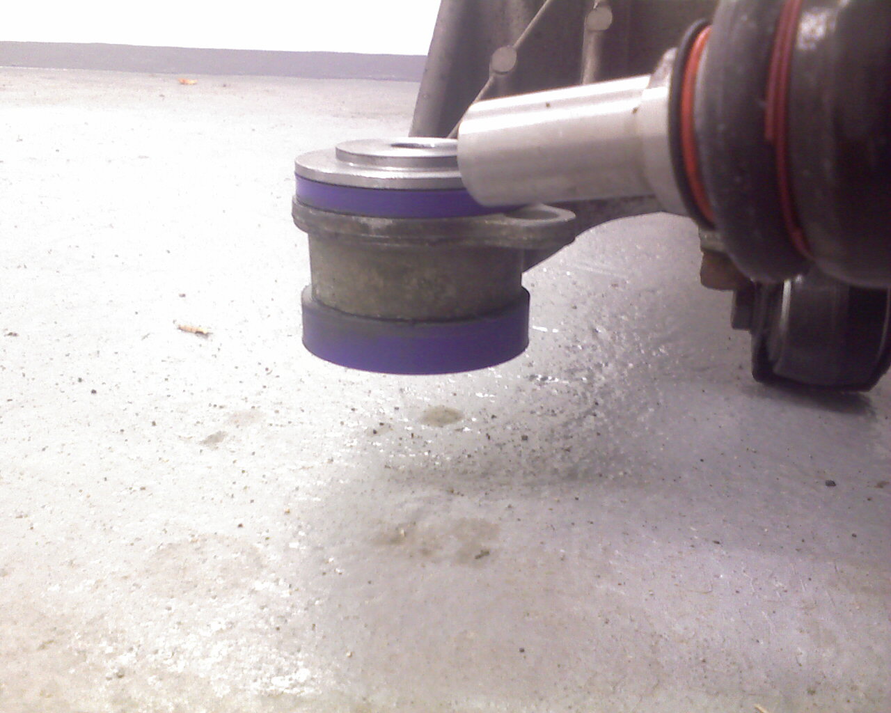Silentbloky z nápravnice vylisovat tlačením na tu menší podložku silentbloku (od domku bumerangu). Jde to ztuha, ale vylisoval jsem to na lisu za 5K, co dává Kelly nebo Elit u kamaráda v dílně. Most je hliníkovej, lisovat opatrně, nejlépe mít podložené oko, ve kterém je silentblok, vhodným kusem trubky o průměru 67-75 mm.
