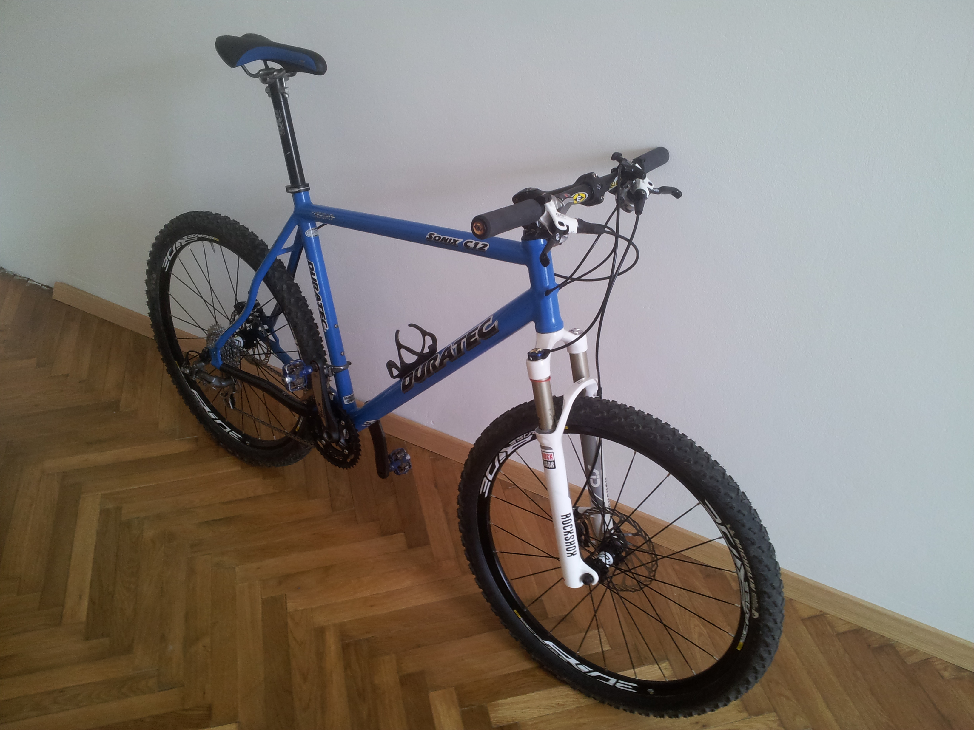 Kolo tě asi nezaujme, pač pokud si pamatuju z FBK, tak ty jsi na flatovej, ale jinak je to moje poloveteránské MTB - rám jsem si nechal udělat přímo na sebe v roce 2001 ještě na závodění a nějak se ho nechci vzdát, protože mi skvěle sedí. Většina dalších věcí je pak letos z jara, kdy proběhla menší renovace - kola Mavic Crossride, vidla Rock Shox SID RLT, brzdy Avid Elixir CR... zbytek komponentů většinou XTR z předchozí dekády. Proč to měnit, když to drží