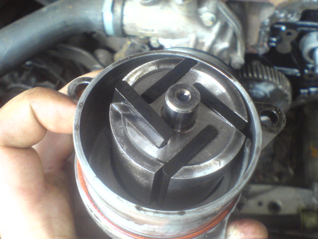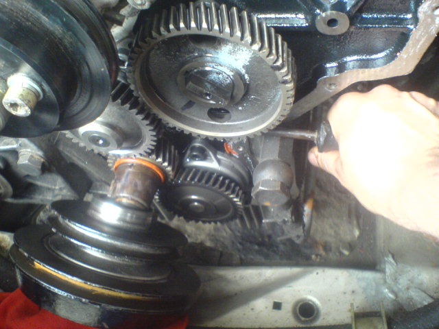 3/sundáte prsa, vytočíte 3 šrouby na vývěvě(nevím to tam má ford, když vývěvu má na alternástoru) pozor jeden šroub jde jedině násilím, vadí mu ozubené kolo-viz foto ŠROUB vývěvu pomalu vyndaváte ven a pomáháte si šroubovákem, protože opět jde velmi z tuha, kde opět vadí ozubené kolo viz foto páčit: vyndavejte vývěvu pomalu a opatrně, protože vám vypadají lamely viz foto vývěva: natočím vývěvu tak aby šla na značky jak na klice, tak i na vačce viz foto zuby: pozn.alfa 75 měla na vývěvě keště předpětové kolečko, které vymezovalo vůli mezi zuby, osobně si myslím, že to není špatnej nápad, ale už jsme to jednou viděl zničené a na tomto 2,8TD z roku 1992 již tento mechanismus není