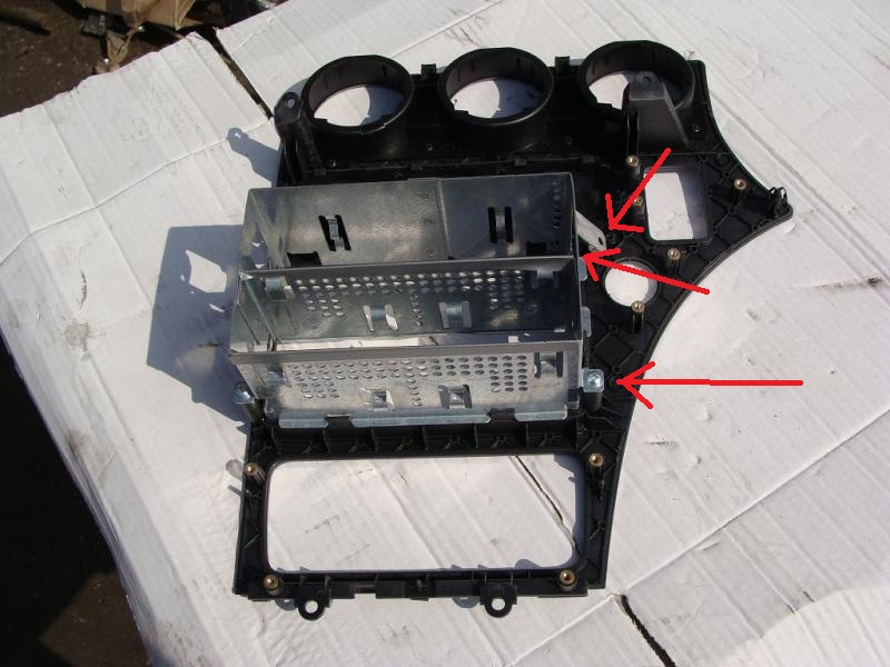 Musíš vyndat celý středový panel ten plech drží 6 šroubků 2 jsou vidět ,když vyndáš rádio a 4 jsou z druhé strany panelu. Viz. foto