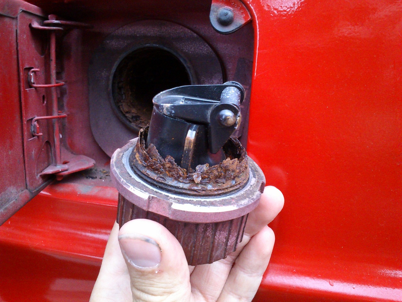 Po projíždce jsme tam ještě chvíli kecali a okouněli (to už majitel byl pryč) a náhodou jsme se i koukli na víčko nádrže. To nám totiž zůstalo v ruce i s kusem hrdla... Viz foto. To trochu podtrhlo to co jsem psal na začátku. A sice, že se asi opravovalo jen to co je vidět.