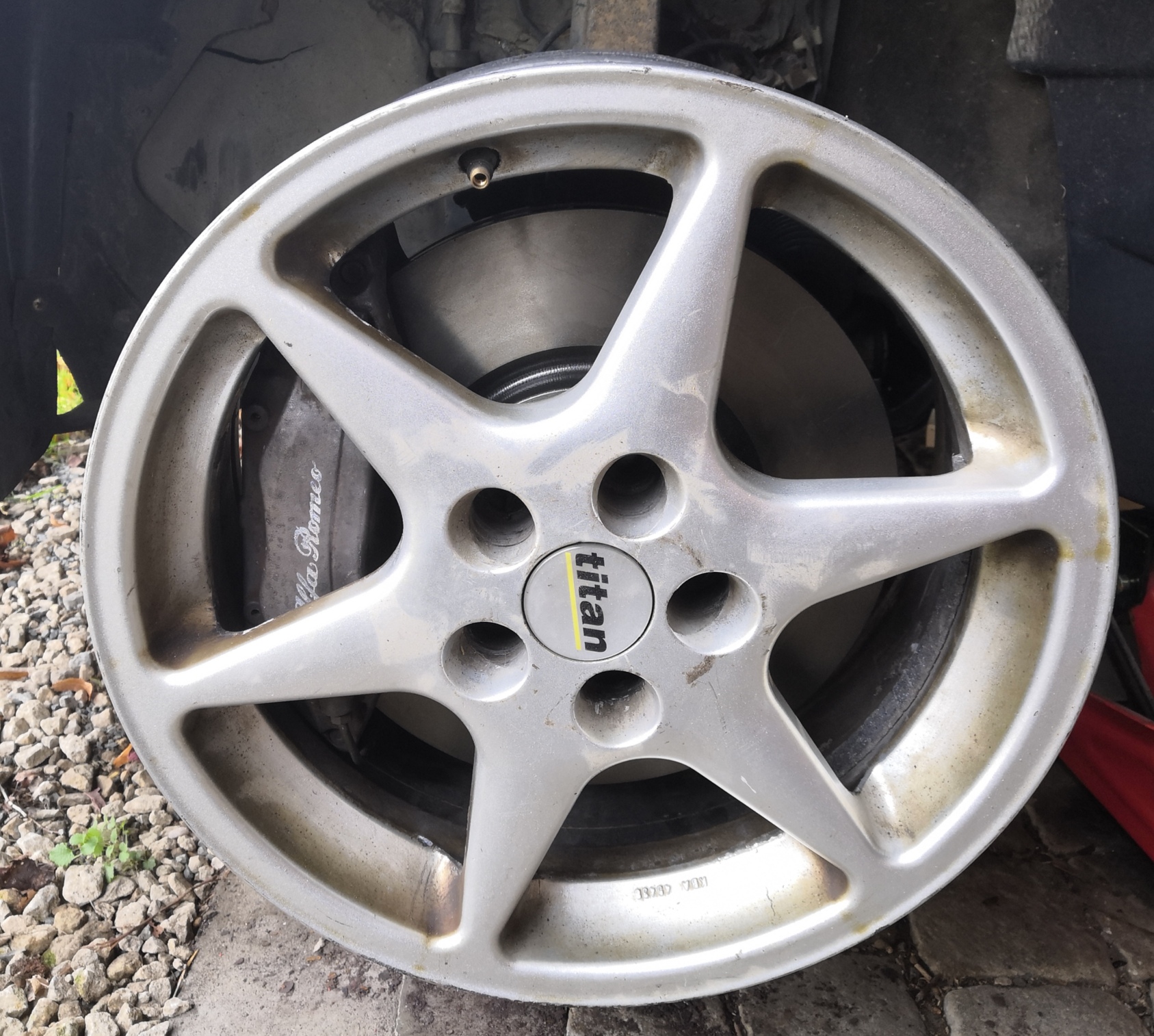 Každopádně jsem průběžn začal s nějakou běžnou údržbou. Auto při přidání skočilo půl metru doprava, při ubrání doleva, už od pohledu to bylo rozbíhavý asi 5 cm. Takže jsem posháněl ramena - horní i spodní, zabojoval jsem se strongflexama a nasadil. Původní kola jsem sundal a nasadil 17tky tristary se semislickama a namontoval stabilizátory z GTA. Ve skříni mně tam leží pár věcí, které jsem měl původně na nissana, ale asi půjdou na alfici. Tj. olejový chladič se sendvičem s termostatem, čtyřpístky z Fiata Coupé se žlutýma EBC, lepší volant a další. Musím i do budoucna počítat s Q2. Viz. dále. Na stojanu mi visí druhý, trochu výkonnější motor. Primárně to chci dostat do průměrného stavu takhle staré ojetiny a povozit se. Leštěnka z toho nikdy nebude a ani to není mým cílem.