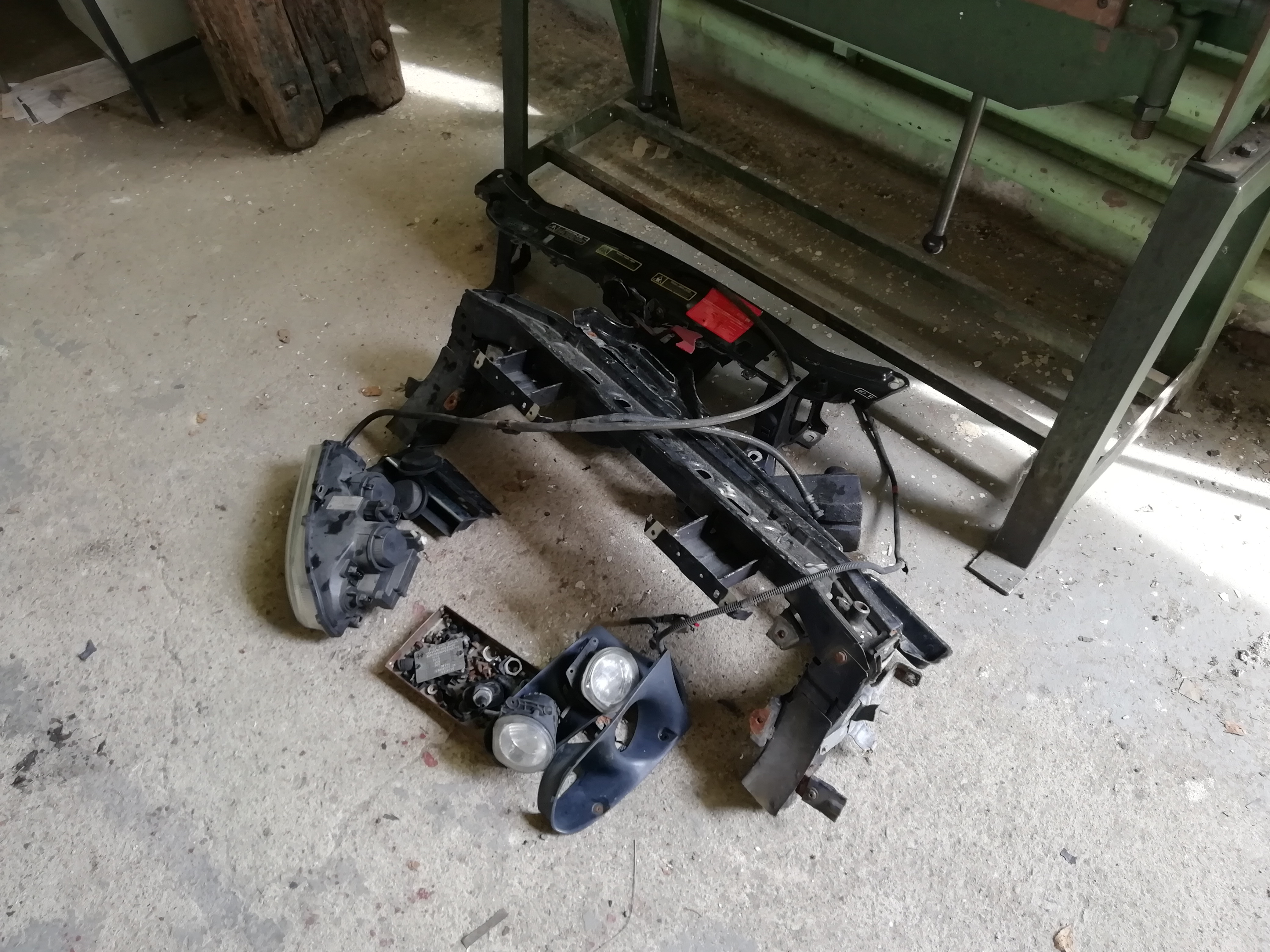 V sobotu jsem se k autu zase na chvíli dostal. Odstranil jsem všechny poškozené díly, které sundat šly a namontoval "novou" kapotu. Taky jsem k autu navozil téměř všechny náhradní díly. Teď už to vlastně čeká na klempíře, který musí vyměnit tu spodní poškozenou příčku. Tak shnilá je, protože už je z minulosti měněná a není to originální díl.