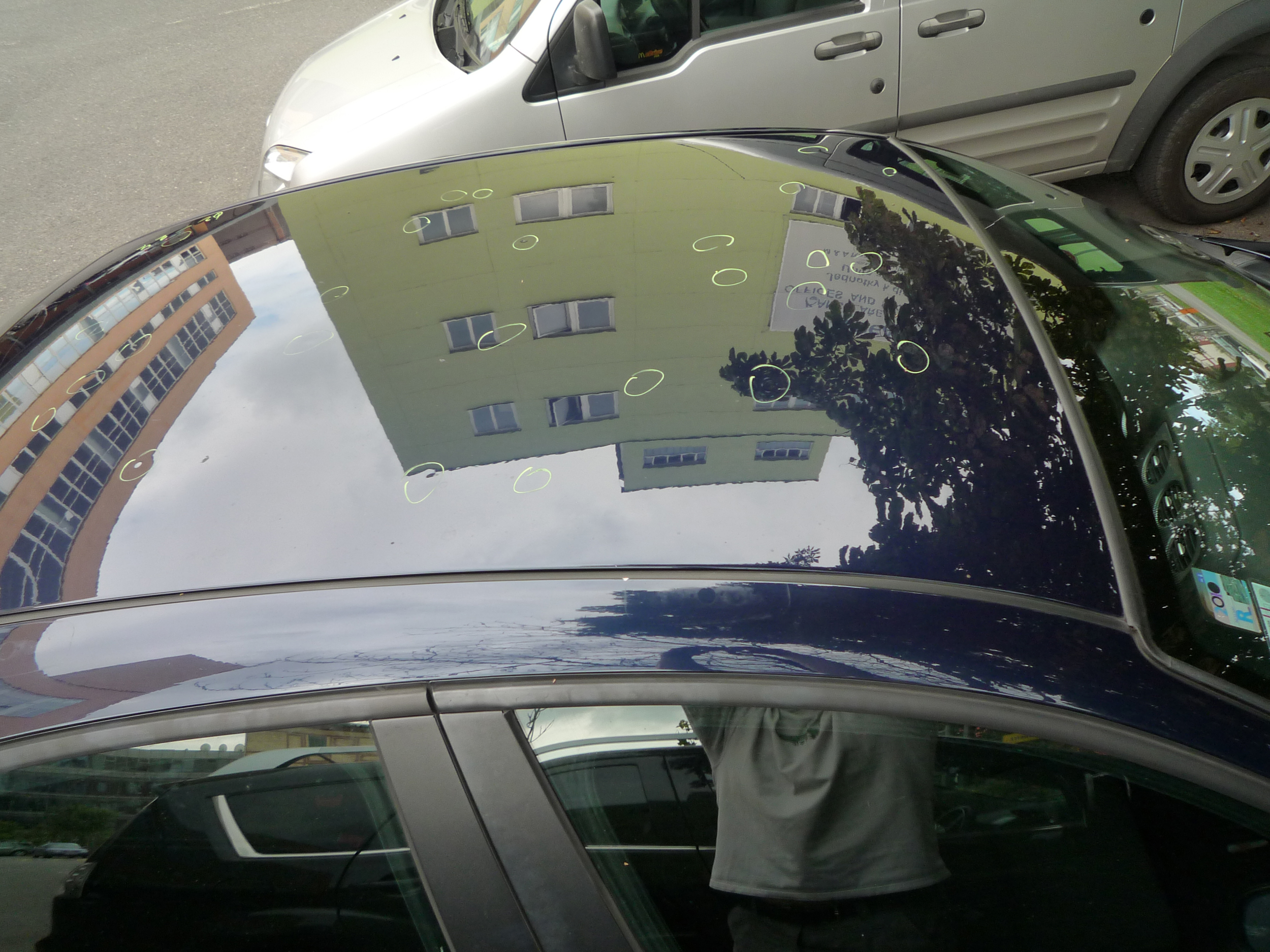 bo v sevisu, kam mě nadirigovali z pojišťovny budou mít na nás čas až nejdřív za 14 dní... Zkusim ten zdývající 1,5 tkm dojezdit až potom ale nevím nevím. Přikládám pár smutných obrázků s pojišťováckým zkrášlením. 27 děr ve střeše, 7 v kapotě, 2 ve víku od kufru, 2 LZ blatníku a díra v čelním skle - na tu jsem tedy čuměl v pondělí ráno jak zjara - myslel jsem, že tohle umí jen šutr na dálnici...