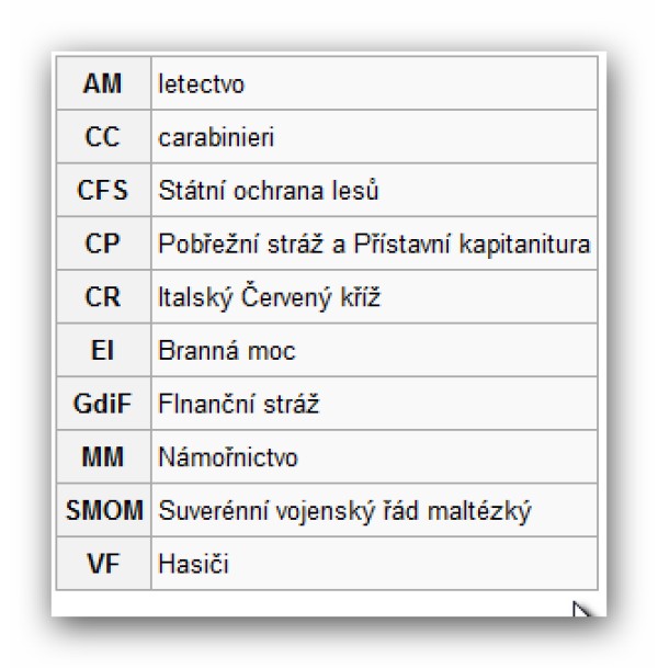 Co se týká "polizia", lze jí velmi vzdáleně přirovnat naší městské policii, ale v IT je sjednocená včetně barevného označení vozidel jejich úprav a uniforem. Jako jediná složka používá běžné SPZ.