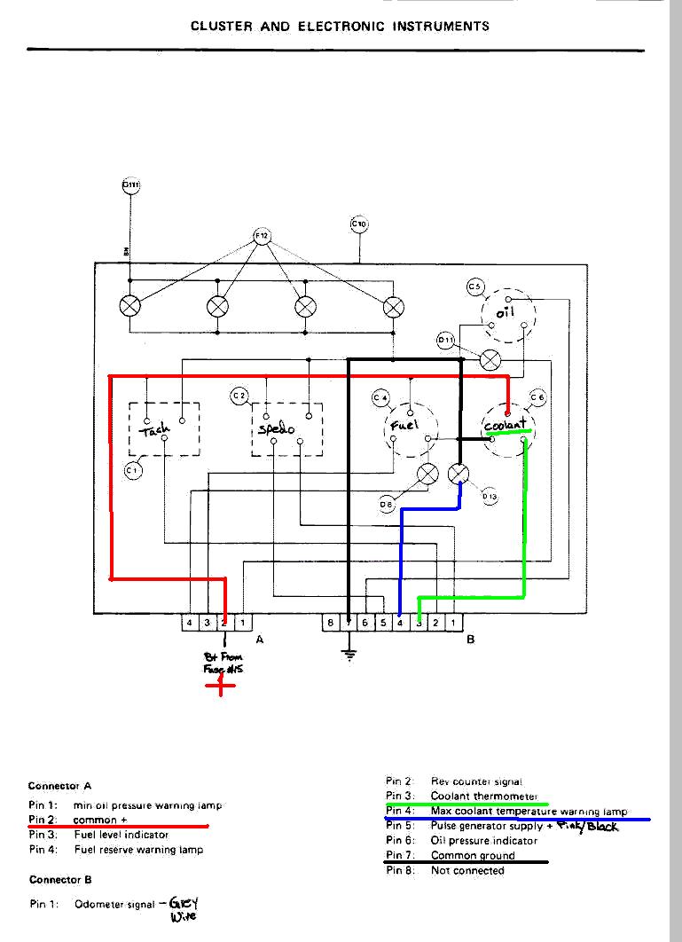řekl bych, že podle tohoto manuálu má čidlo na teplotu vody dva vývody a jeden značí max přehřátí tzn. červenou kontrolku a druhý čistě ukazatel teploty
