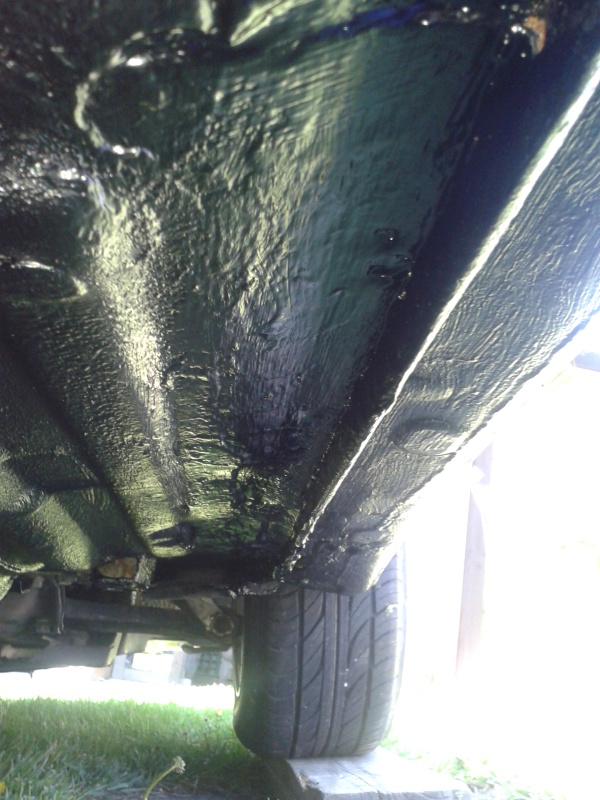 Dneska jsem pracoval na podvozku. Byla to povětšinou liška co šla dolů drátěným kartáčem, pak sem to vzal okolo až ke zdravýmu plechu. Celkem to bylo tak 8x40cm nehorší za kolama, kde je to vystavený odlétavajícímu bordelu. Dvakrát přetřený Hammeriten na rez a dvakrát nátěrem na podlahy Presto, ještě by to sneslo jednu dvě vrstvy tak možná zítra...Snad jsem tim trochu prodloužil životnost podlahy...
